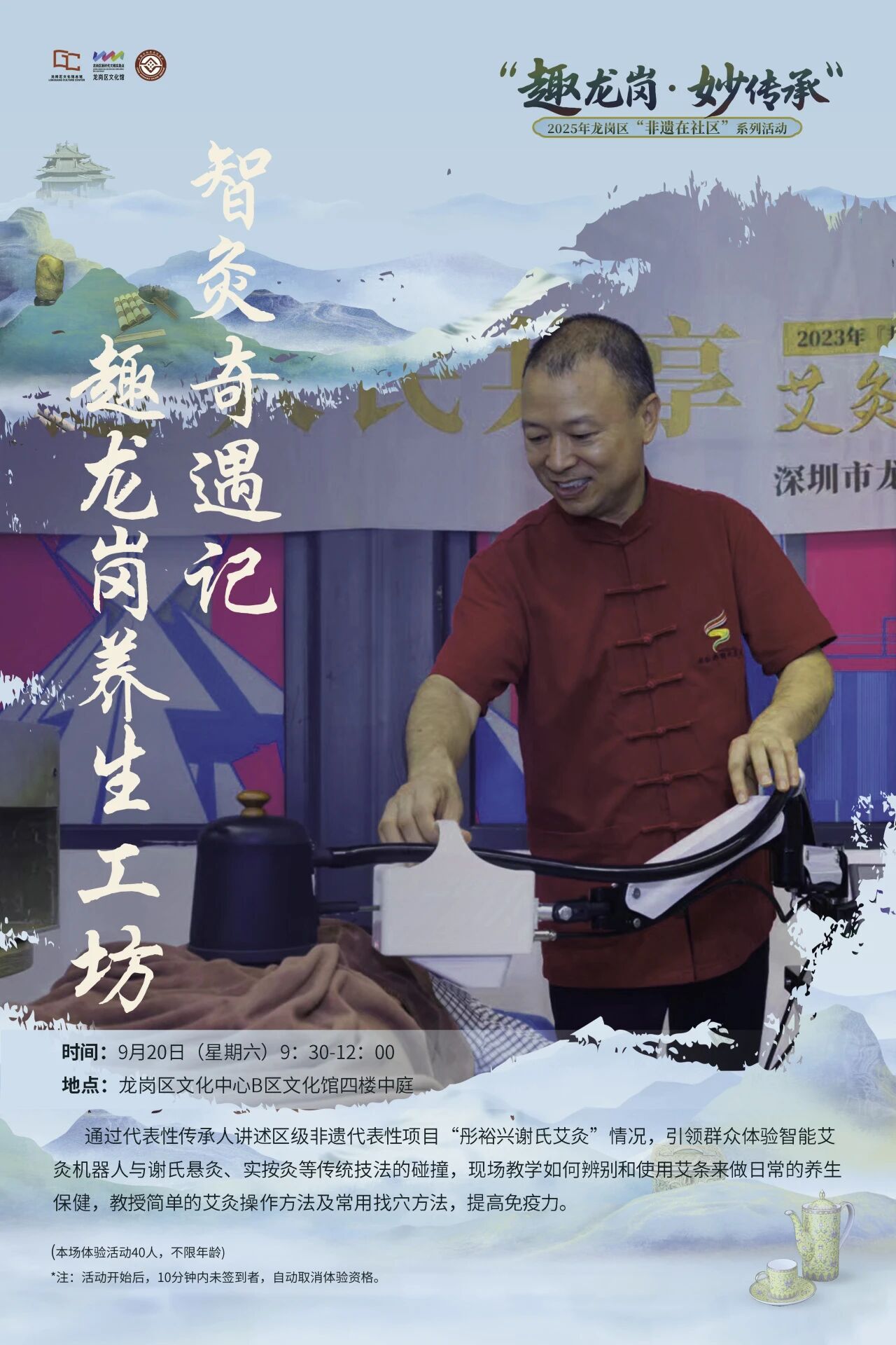 当天9时许,文化馆四楼中庭早已热闹起来,“智灸奇遇记·趣龙岗养生工坊”活动现场,区级非遗“彤裕兴谢氏艾灸”传承人王光瑞正细致讲解艾灸文化。从谢氏艾灸的历史渊源,到悬灸、实按灸等传统技法的操作要点,传承人结合生活案例,让原本专业的养生知识变得通俗易懂。