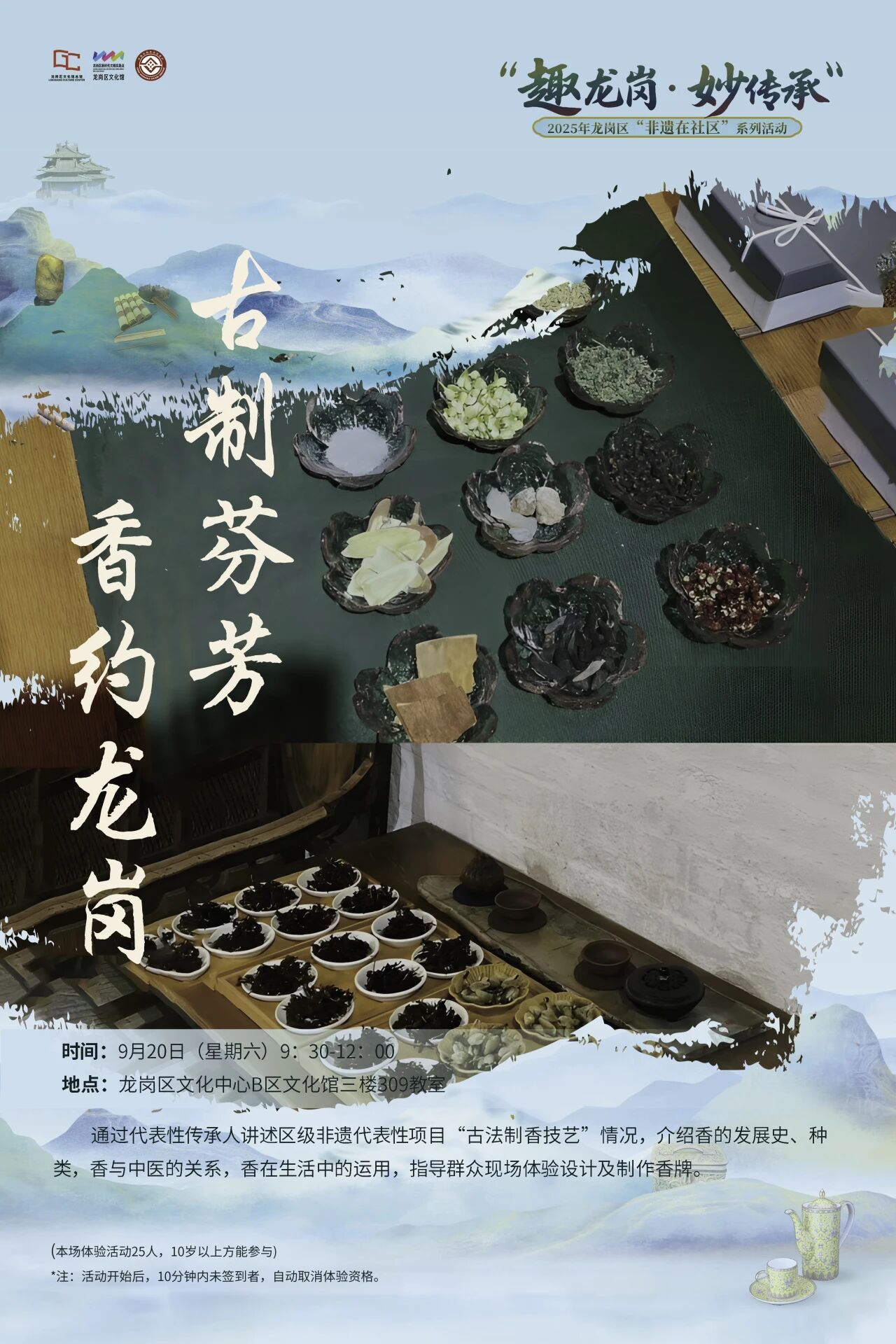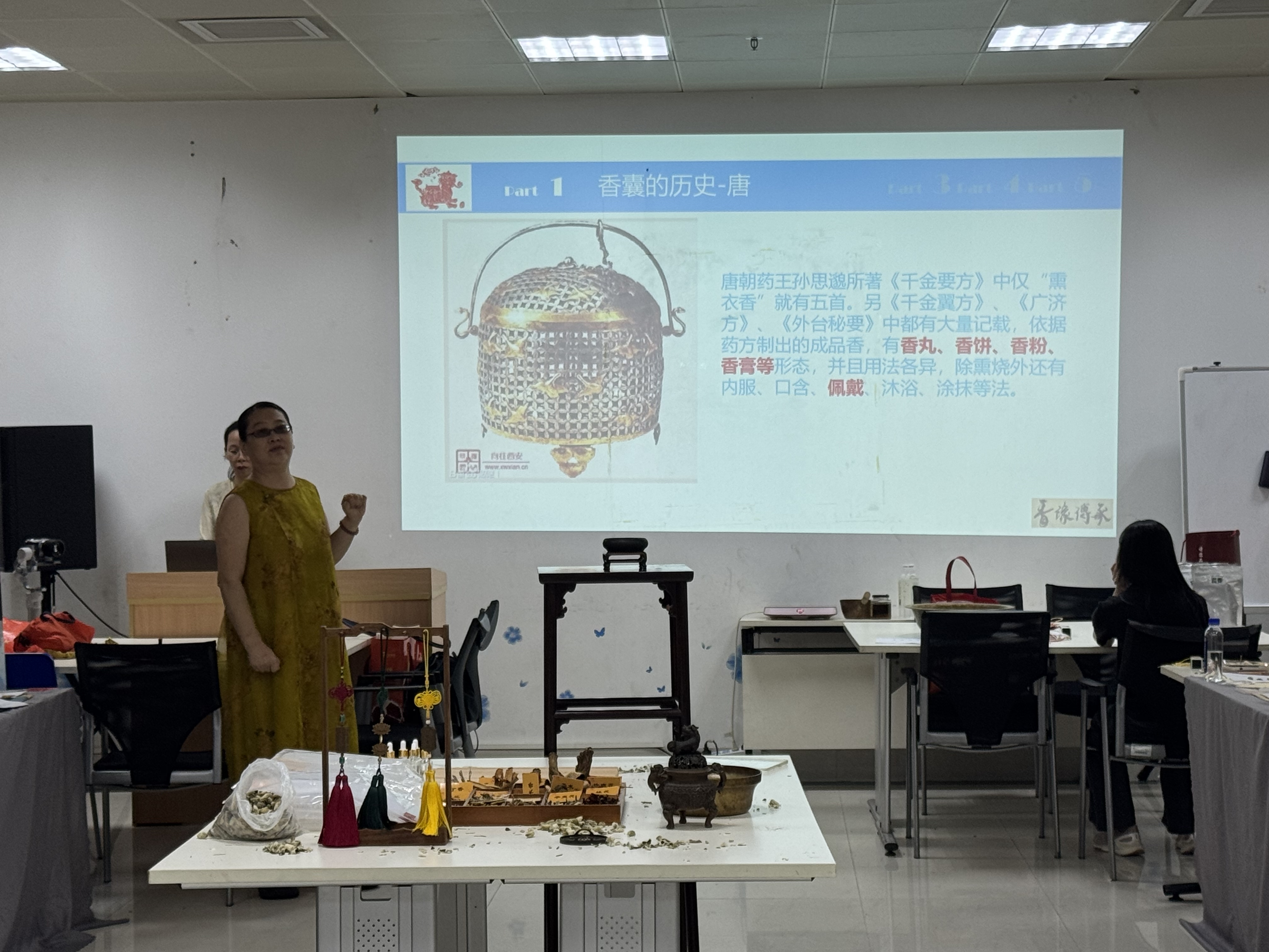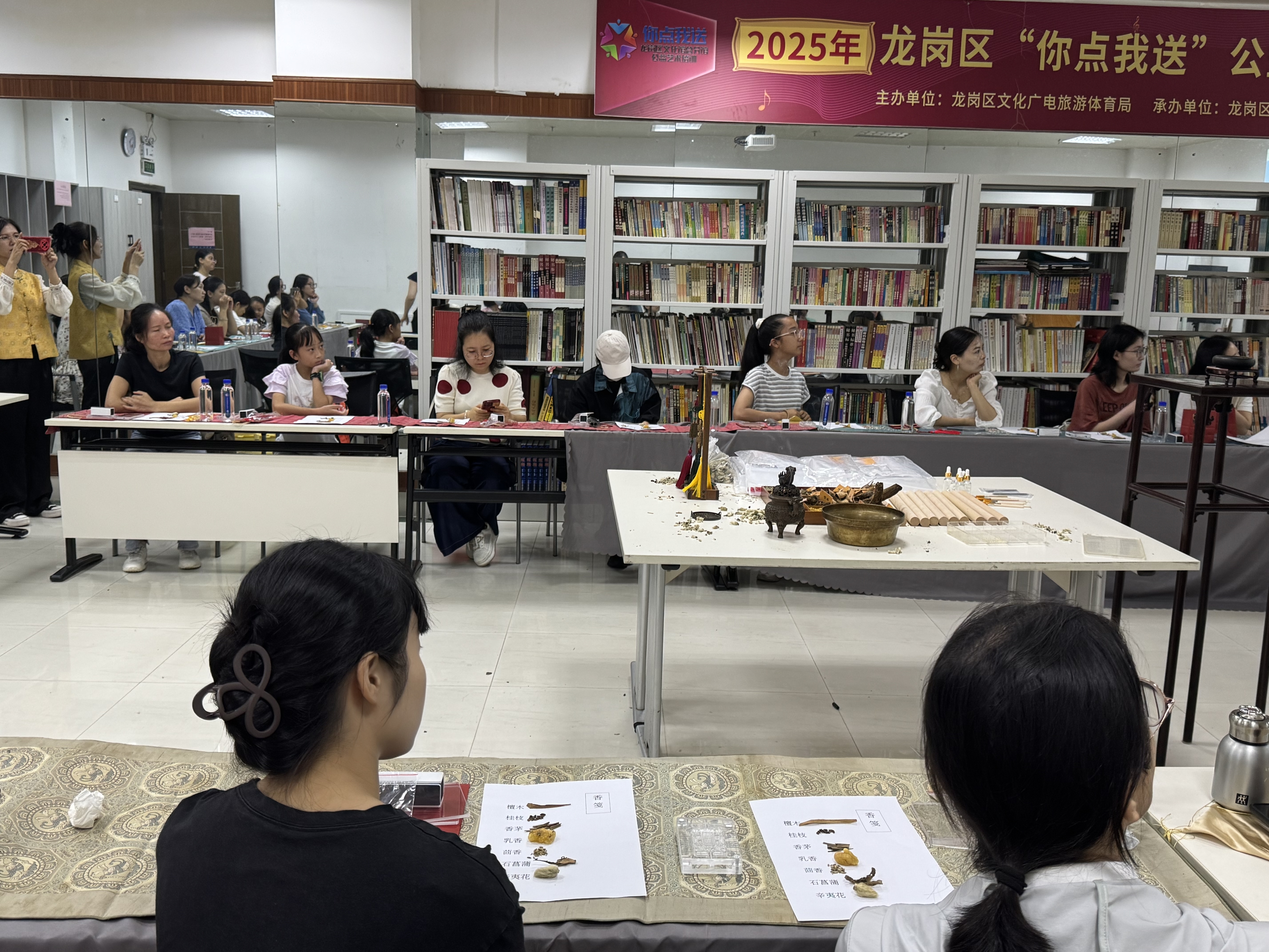 与此同时,三楼309教室内的“古制芬芳·香约龙岗”活动也人气高涨。这里聚焦区级非遗“古法制香技艺”,代表性传承人赵绪芬以“香的发展史”为切入点,从先秦时期的祭祀用香,到唐宋时期融入日常生活的香文化,再到现代香品的创新应用,生动讲述了香与历史、文化、中医的紧密联系。