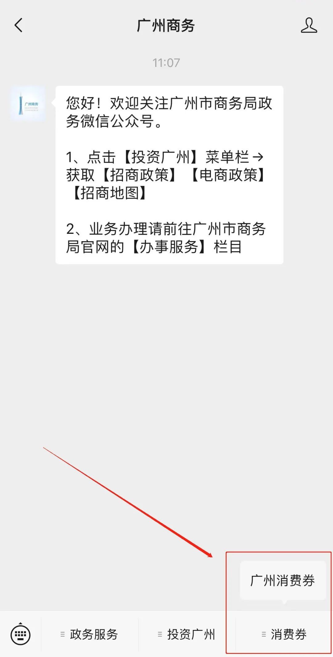 关注“广州商务”微信公众号,首页点击菜单栏【消费券】—【广州消费券】,可直达申领入口。