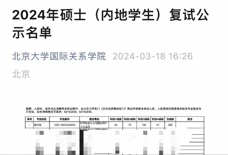 考生“蔡元培”出现在北大国际关系学院硕士复试名单中。南都记者查证发现,登上热搜的考生蔡元培,确实名列北京大学国际关系学院3月18日发布的《2024年硕士(内地学生)复试公示名单》中,并以388分的初试总成绩排名其复试专业——科学社会主义与国际共产主义运动专业第一,科目4(专业课)还考出了141的高分。复试名单公布后,许多北大学生以及校外人士注意到,这位考生恰与著名教育家、革命家、政治家蔡元培同名同姓,因此引发热议。