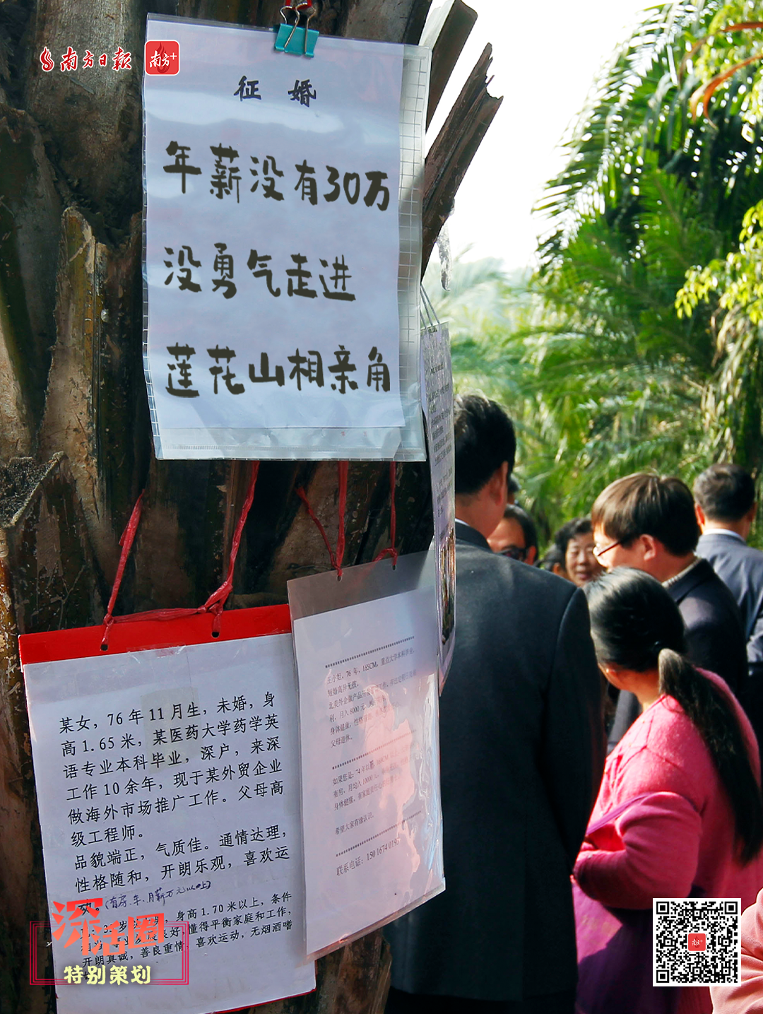 在深圳莲花山,有一个相亲角,是众多青年人相亲的平台
