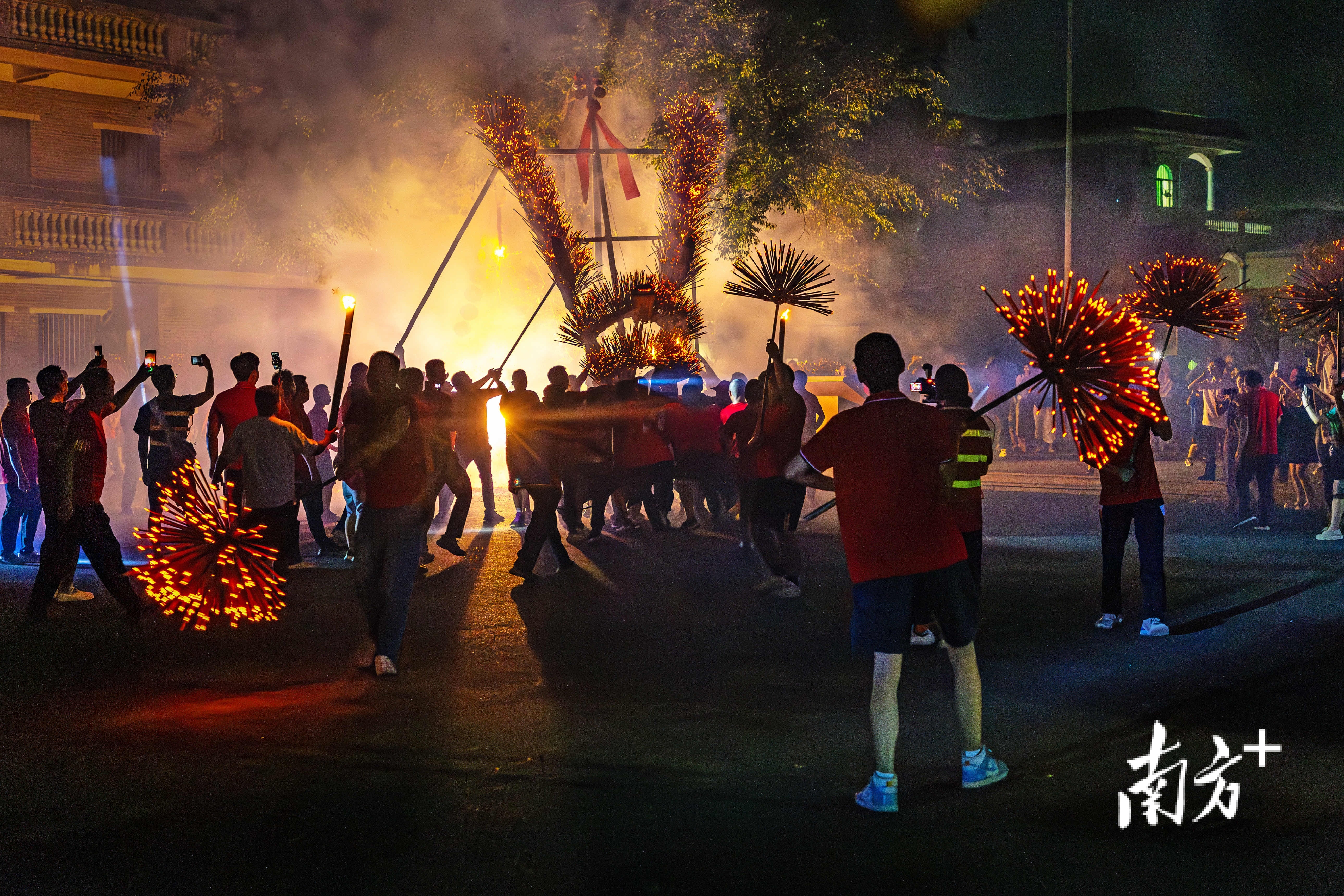 当晚,陈山村锣鼓喧天,醒狮起舞,烟花璀璨,夜如白昼,游客群众欢聚一堂。