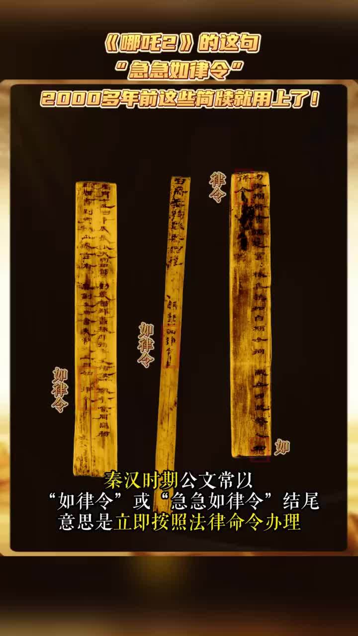 《哪吒2》中的“急急如律令”,在秦汉时期的公文里多次出现。当时公文常以“如律令”或“急急(疾)如律令”结尾,意思是立即按照律令条文执行。随着日常文书频繁使用,这句话也演变成了“催促执行”的意思。详情>>