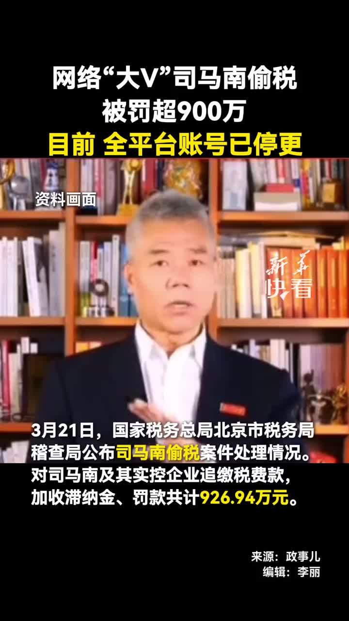 3月21日,国家税务总局北京市税务局稽查局公布司马南偷税案件处理情况。司马南因涉嫌偷税,被罚超过900万元。搜索司马南各平台账号发现,从去年11月初起,其微博、抖音、头条等平台账号均已停止更新。详情>>