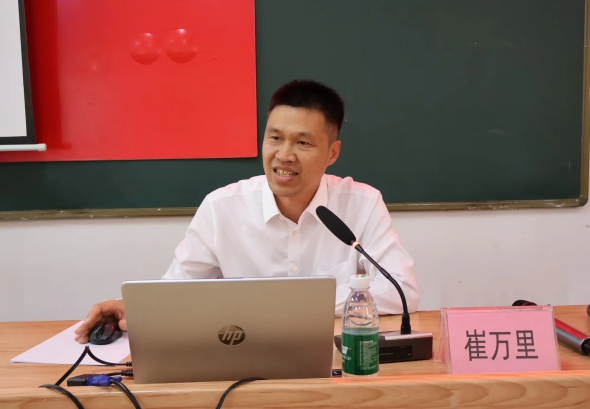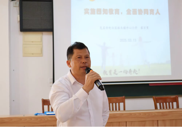 茂名市崔万里名校长工作室主持人、林头镇中心小学党支部书记、校长崔万里围绕《实施四知教育,全面协同育人》主题进行分享,详细介绍了学校以“四知教育”为核心的育人模式,以及“木棉花儿开”系列活动如何紧密围绕“四知教育”开展,从阅读节到体育节,从文化浸润到艺术创作,全方位提升学生素养。