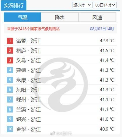 值得注意的是,昨天(8月3日)全国最高温的前十由浙江包揽,均超过40℃。