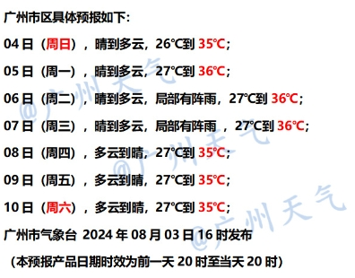 4日,广东大部市县天晴炎热,局部有(雷)阵雨;最高气温普遍介于34℃~37℃之间,部分市县可达38℃左右。
