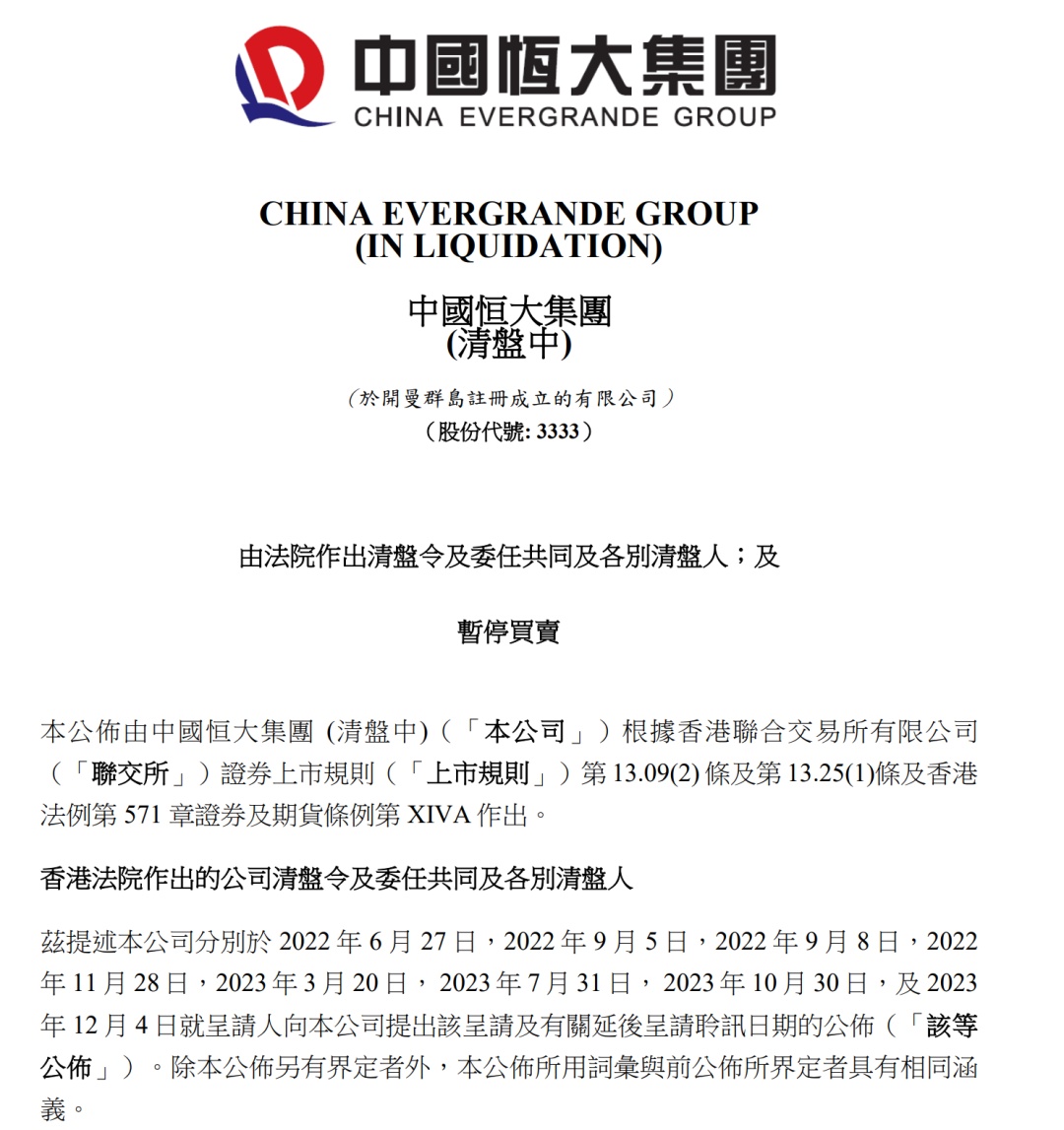 中国恒大表示,公司将遵照上市规则就清盘事宜的任何最新发展,另行刊发进一步公布。中国恒大提示,公司股东、投资者及潜在投资者在买卖本公司证券时务请审慎行事。