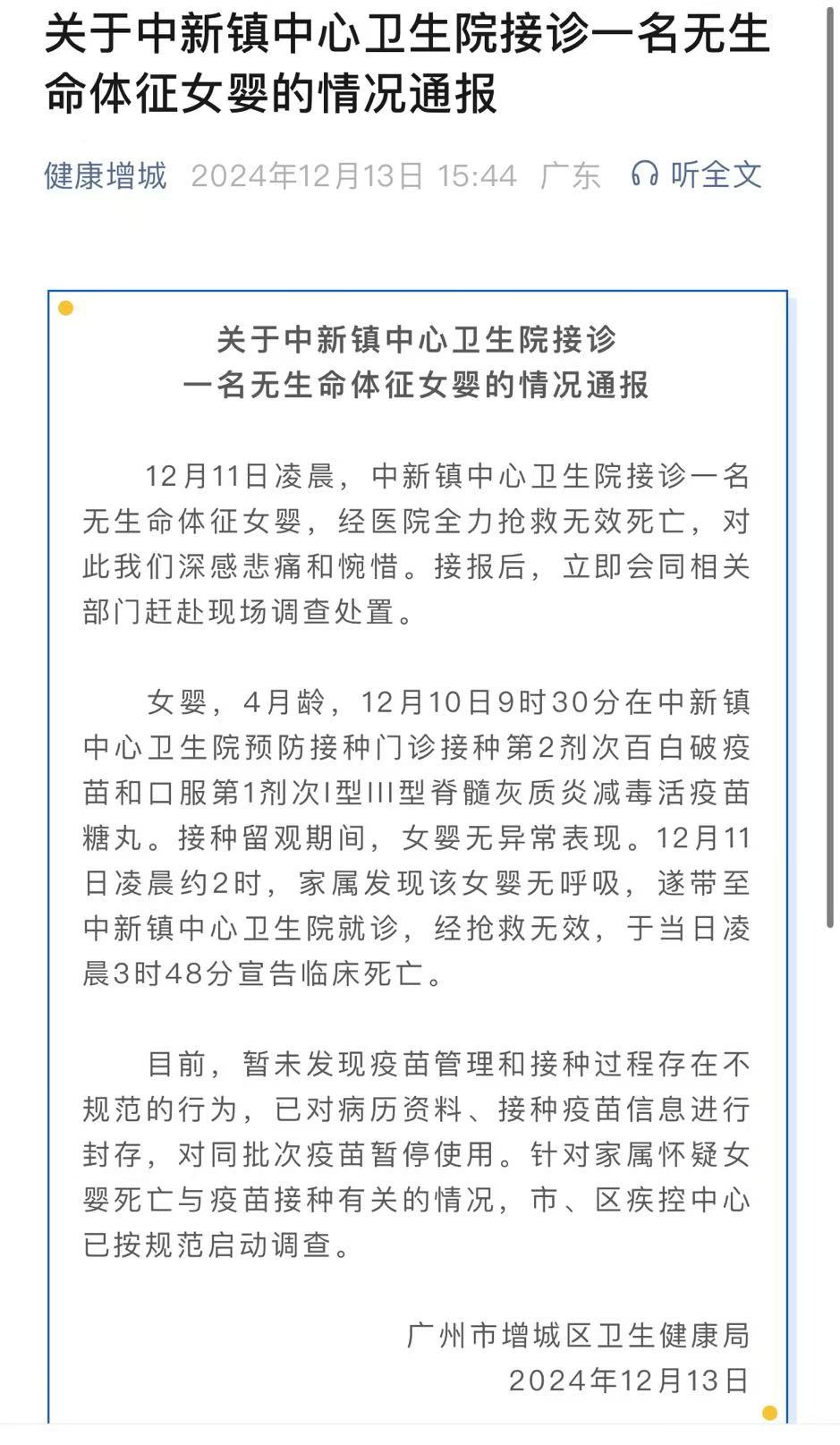 12月13日,广州市增城区卫生健康局通报:12月11日凌晨,中新镇中心卫生院接诊一名无生命体征女婴,经医院全力抢救无效死亡,对此我们深感悲痛和惋惜。接报后,立即会同相关部门赶赴现场调查处置。