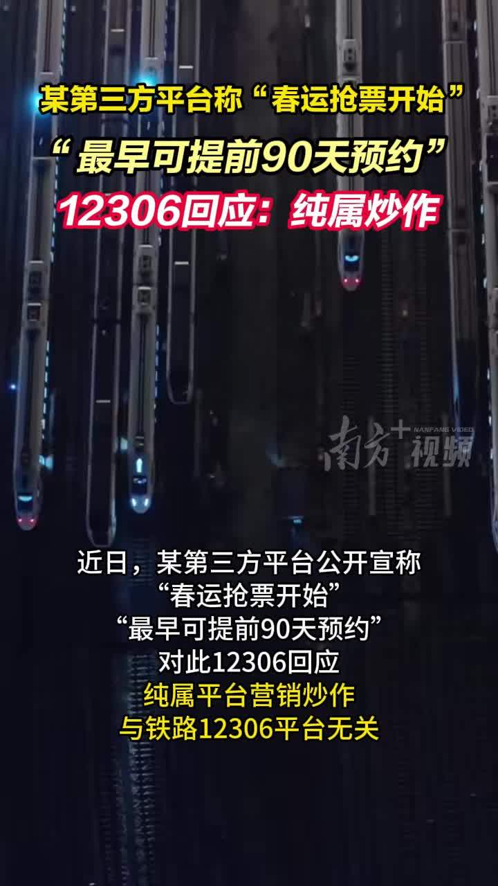 近日,某第三方平台公开宣称“春运抢票开始”“最早可提前90天预约”,纯属平台营销炒作,与铁路12306平台无关。该行为严重误导广大旅客,扰乱火车票正常票务秩序。对此,铁路12306平台正告相关第三方平台,务必立即中止此类营销炒作行为。