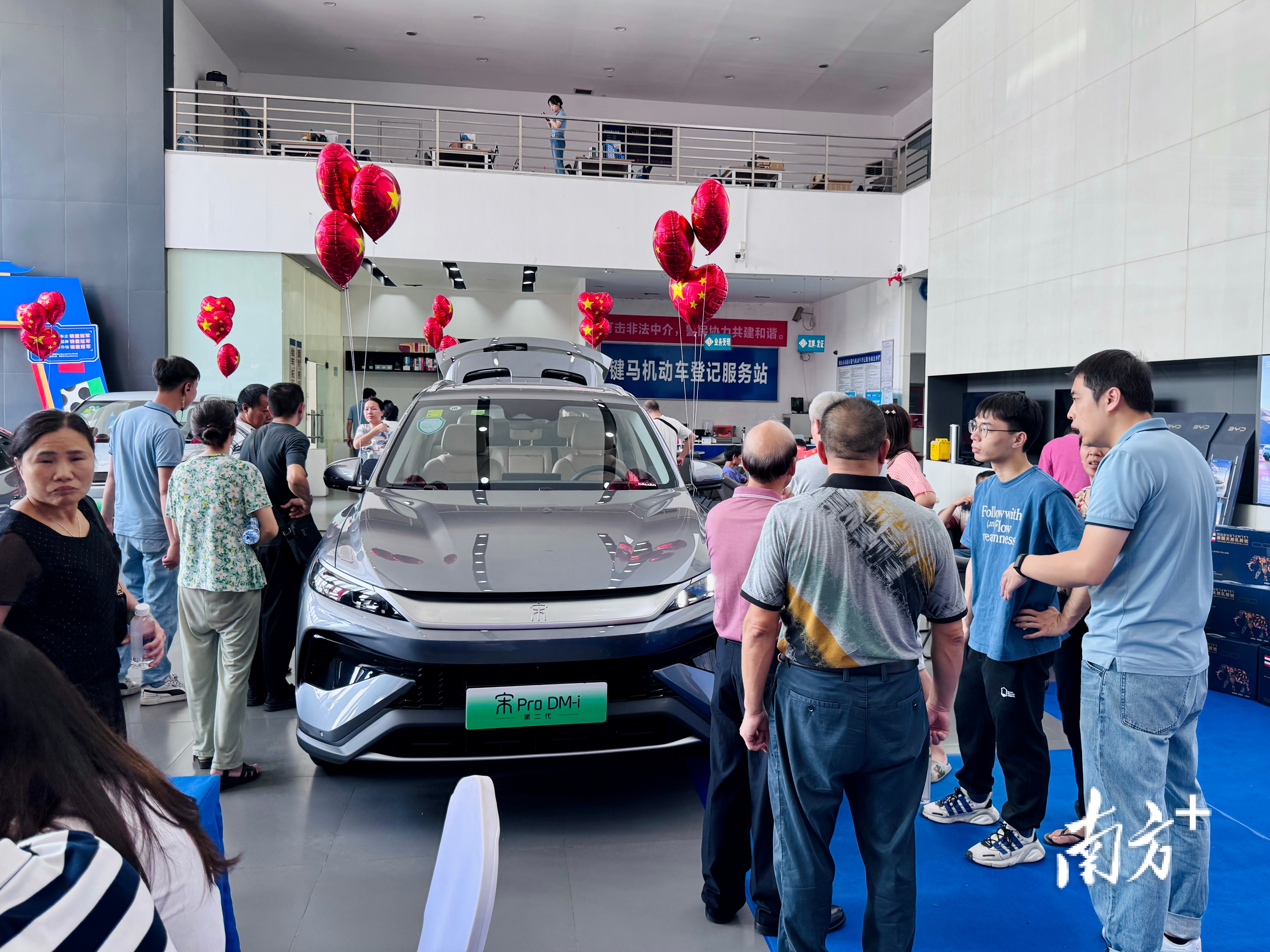 10月1日,南方+记者来到佛山键马比亚迪4S店,只见店内顾客络绎不绝,不少消费者拖家带口前来看车。其中,搭载比亚迪第五代DM-i技术的秦L DM-i、宋L DM-i、汉DM-i、二代宋Pro DM-i等车型备受关注,前来试驾的客户甚至排起了队。