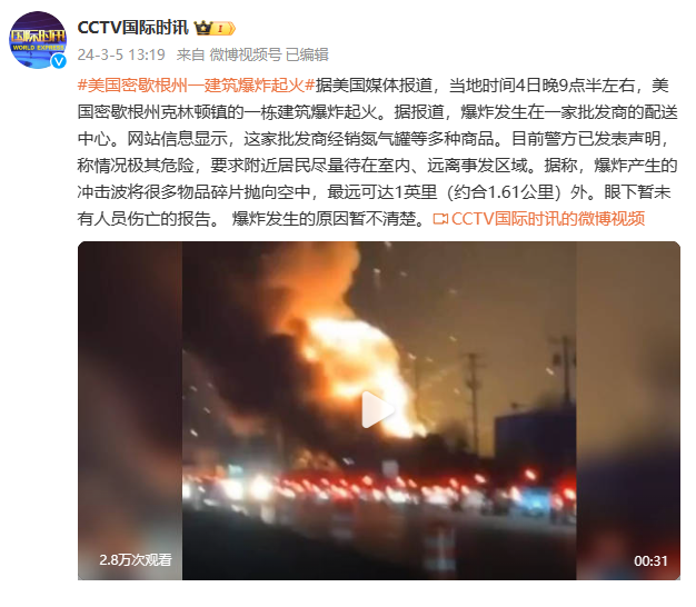 据美国媒体报道,当地时间4日晚9点半左右,美国密歇根州克林顿镇的一栋建筑爆炸起火。据报道,爆炸发生在一家批发商的配送中心。网站信息显示,这家批发商经销氮气罐等多种商品。目前警方已发表声明,称情况极其危险,要求附近居民尽量待在室内、远离事发区域。据称,爆炸产生的冲击波将很多物品碎片抛向空中,最远可达1英里(约合1.61公里)外。眼下暂未有人员伤亡的报告。 爆炸发生的原因暂不清楚。