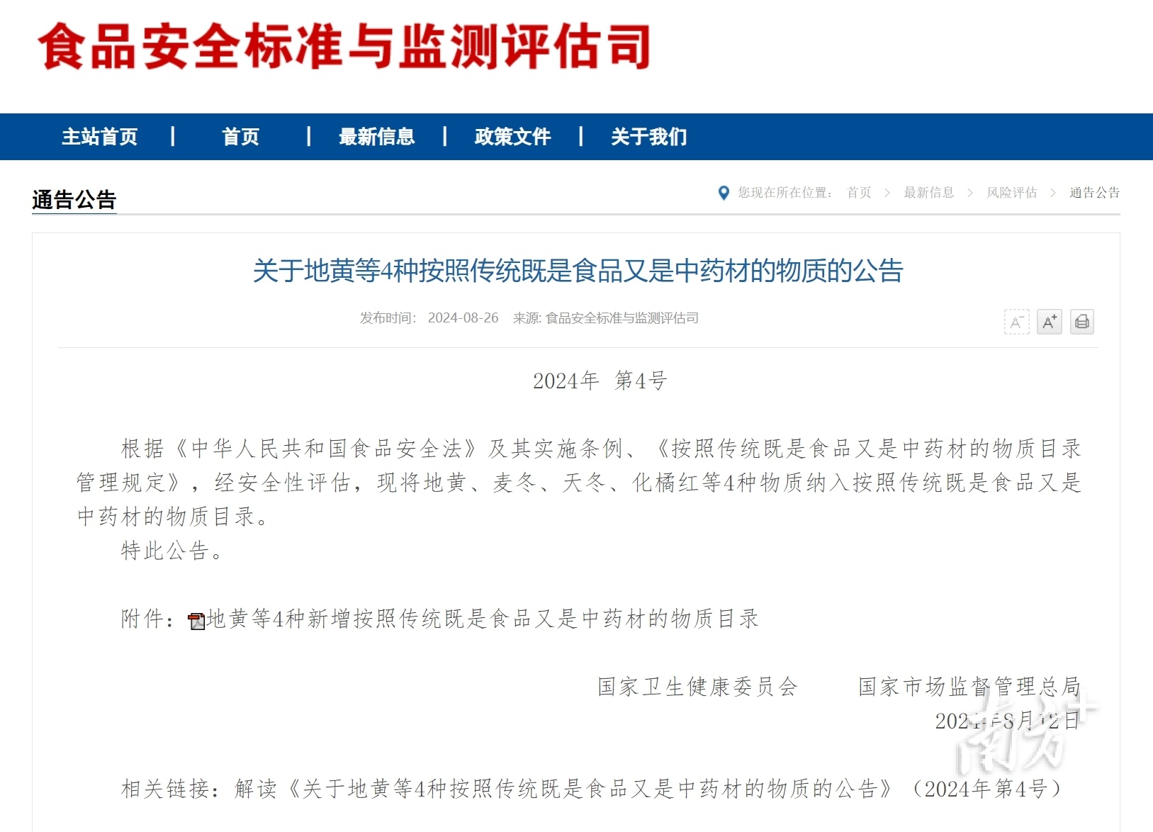 8月26日,国家卫生健康委和国家市场监督管理总局联合发布公告,将化橘红、地黄、麦冬、天冬4种物质纳入按照传统既是食品又是中药材的物质目录。这标志着产自茂名化州市的道地中药材化橘红“药食同源”得到认定,化橘红产品能够进入更多的销售领域。