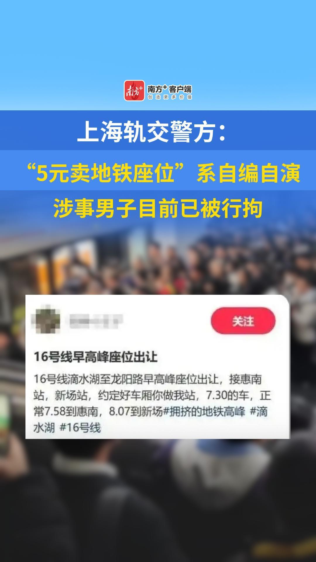 上海轨交警方:“5元卖地铁座位”系自编自演涉事男子目前已被行拘