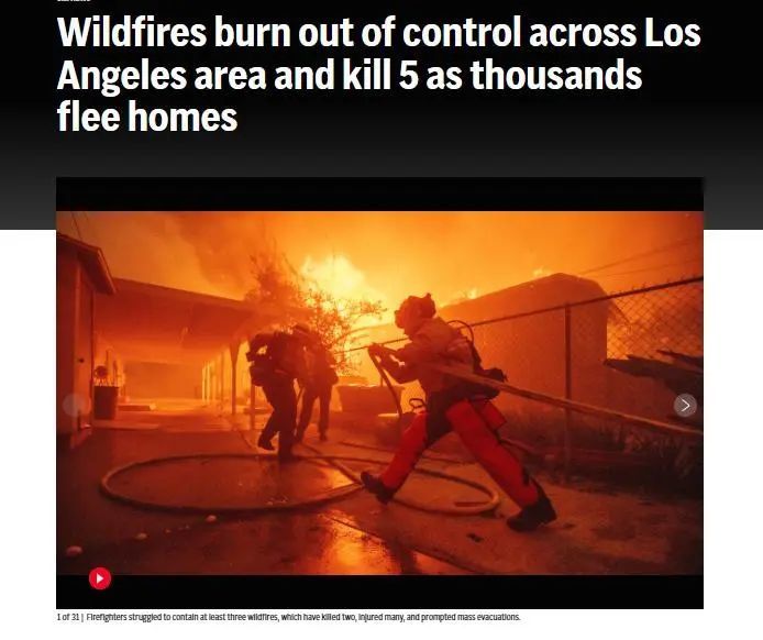 另据央视新闻报道,美国加州洛杉矶仍在大面积燃烧的帕利塞兹大火已经成为洛杉矶历史上最具破坏性的火灾,预计摧毁了1000座建筑。