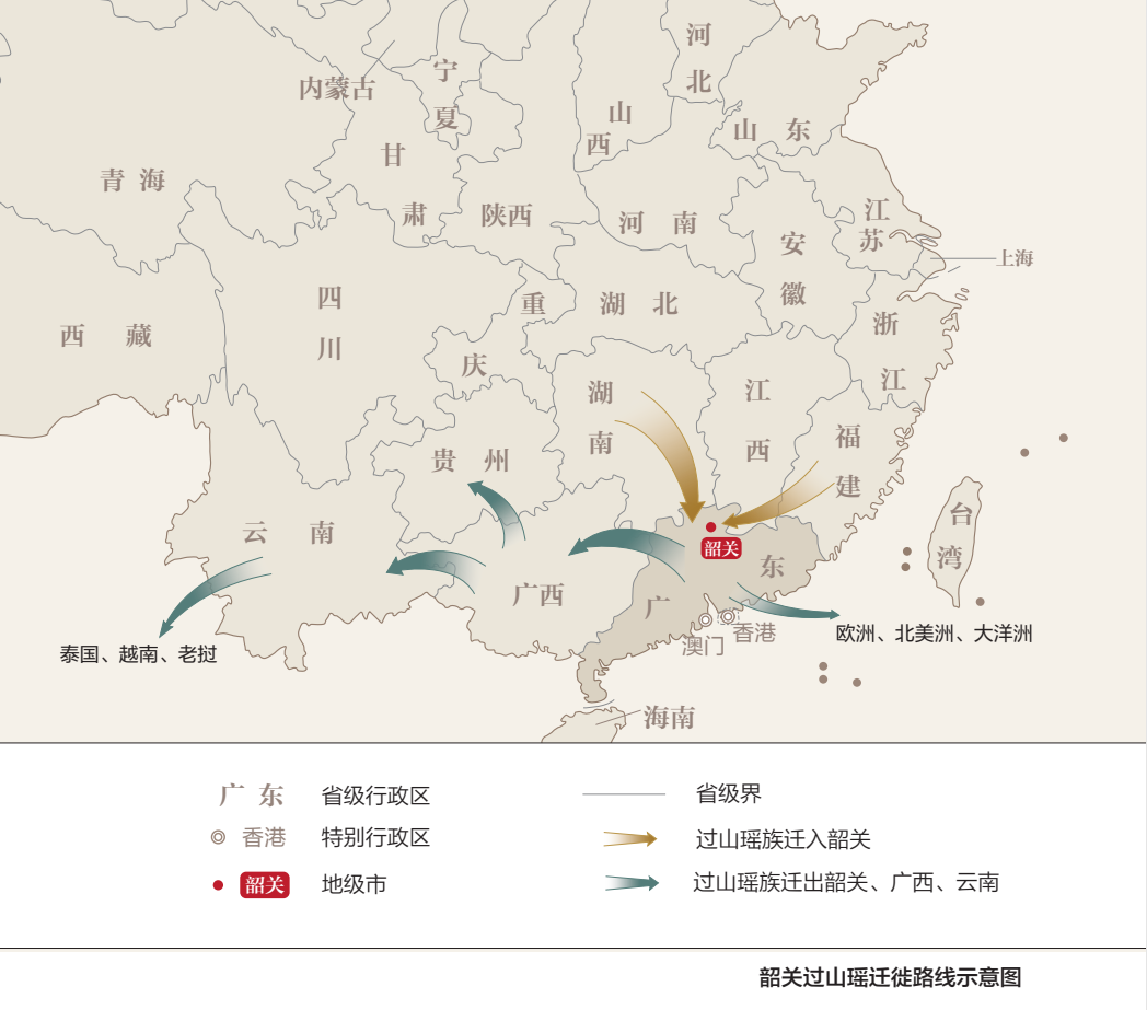 乳源瑶族是踏山而来的民族。在他们脚下“万水千山只等闲”,迁徙脚步从未停歇。他们从乳源出发,经湖南、广东至广西,再入云南、贵州,然后跨越国境,走进越南、老挝、泰国等东南亚国家。20世纪70年代起,他们的足迹延伸至更遥远的美洲、欧洲、大洋洲。