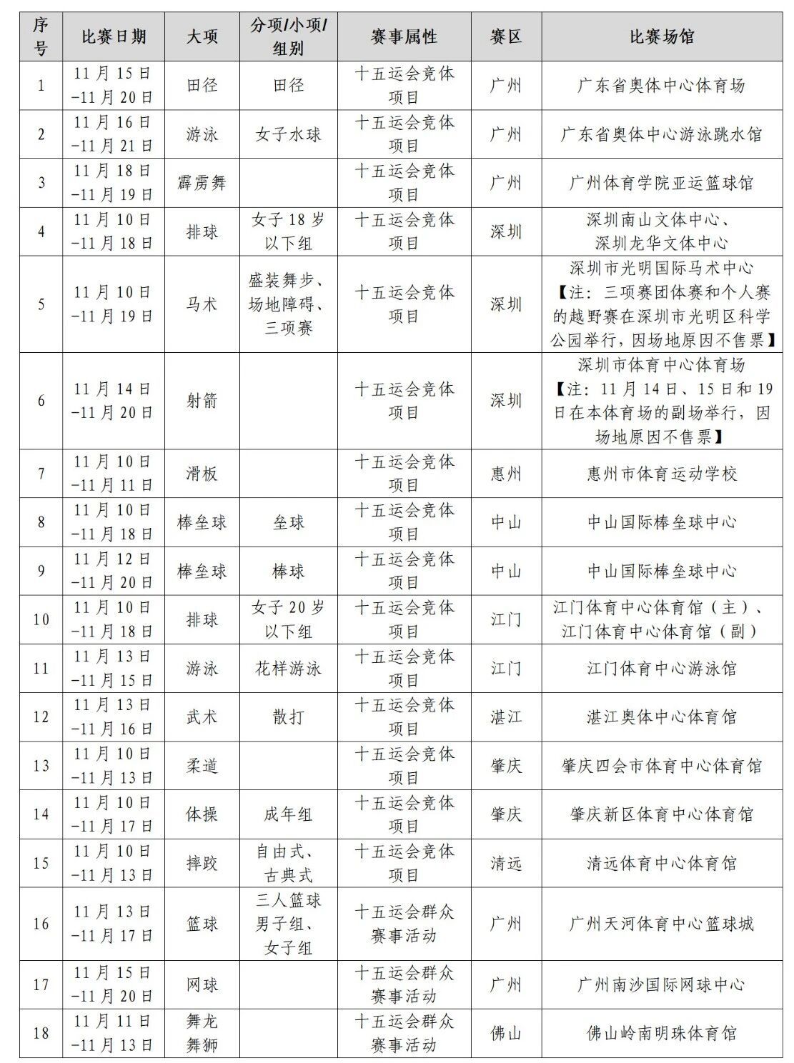 本批次开售的18个体育项目,既包括专业竞技赛事,也纳入了群众参与的高水平赛事活动。赛事将在广东赛区的广州、深圳、佛山、惠州、中山、江门、湛江、肇庆、清远9个城市举办。