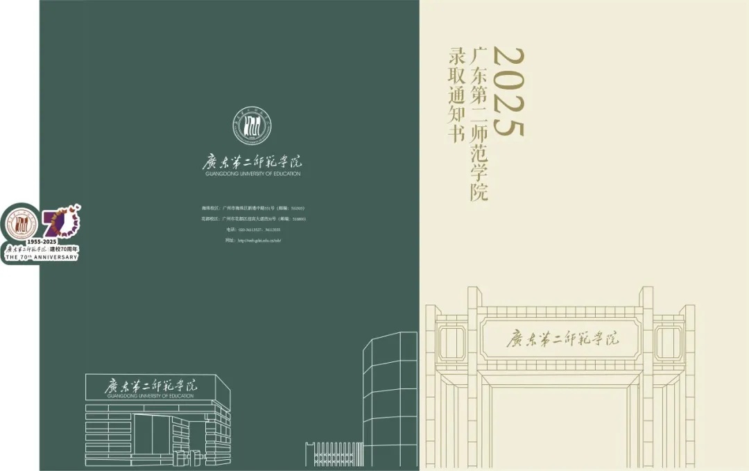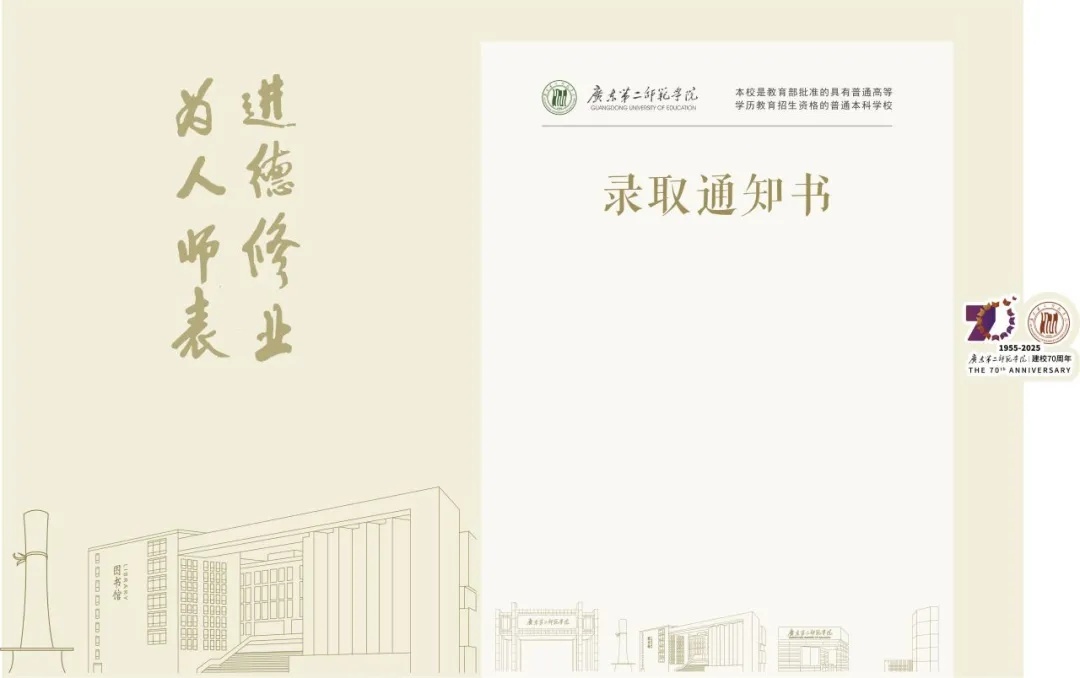2025级录取通知书以深绿底色承载办学底蕴,米白篇章书写未来希冀。封面校徽下的"1955-2025"彩色标识,铭刻二师七十年育人征程;内页庄严印刻"进德修业 为人师表"校训,字字凝聚七十年师道传承。