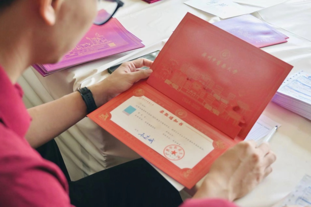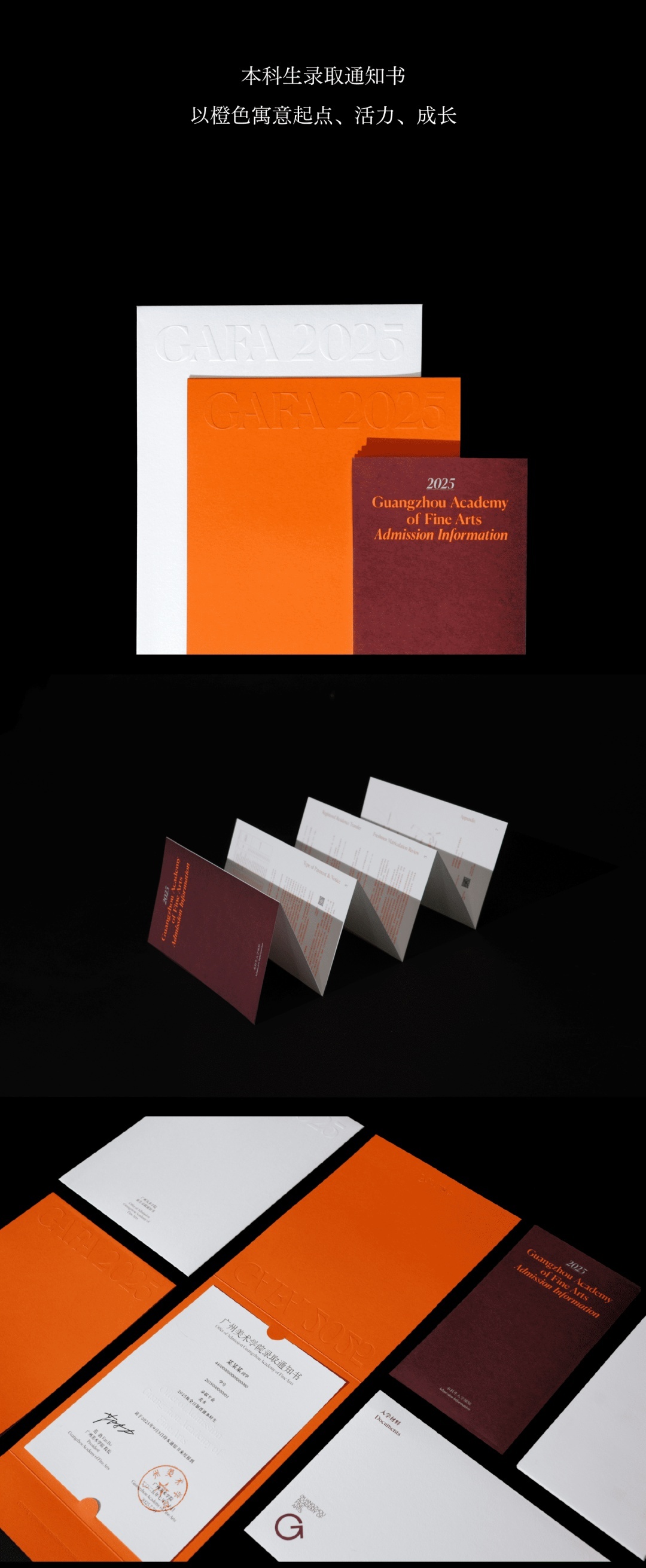 录取通知书以"开启"为核心设计理念,朱砂红与靛蓝的经典配色源自广彩瓷器和香云纱技艺,校门洞开的立体门扣设计配合可展开式结构。