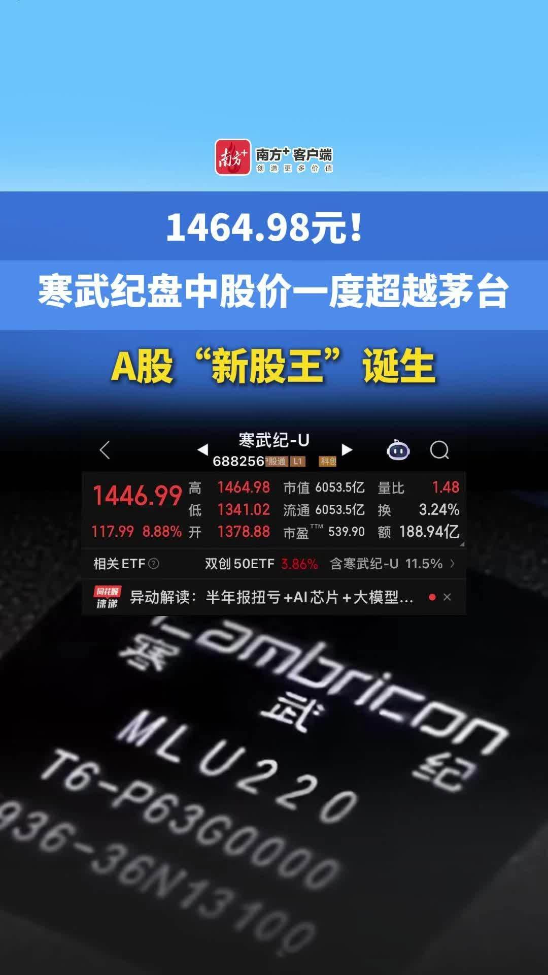 寒武纪盘中股价一度超越茅台,A股“新股王”诞生