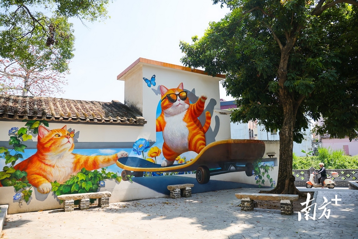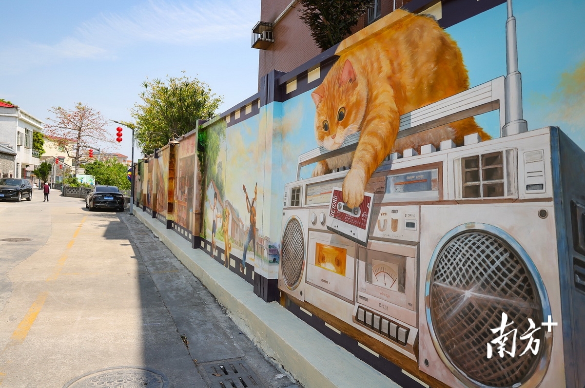 近日,在中山市南朗街道榄边村,原本素净的村居墙面被缤纷色彩与生动笔触“唤醒”。一幅幅墙绘作品分布在村里的街头巷尾——少女花墙、火车造型、潮酷的网红猫咪跃然墙上,相映成趣。
