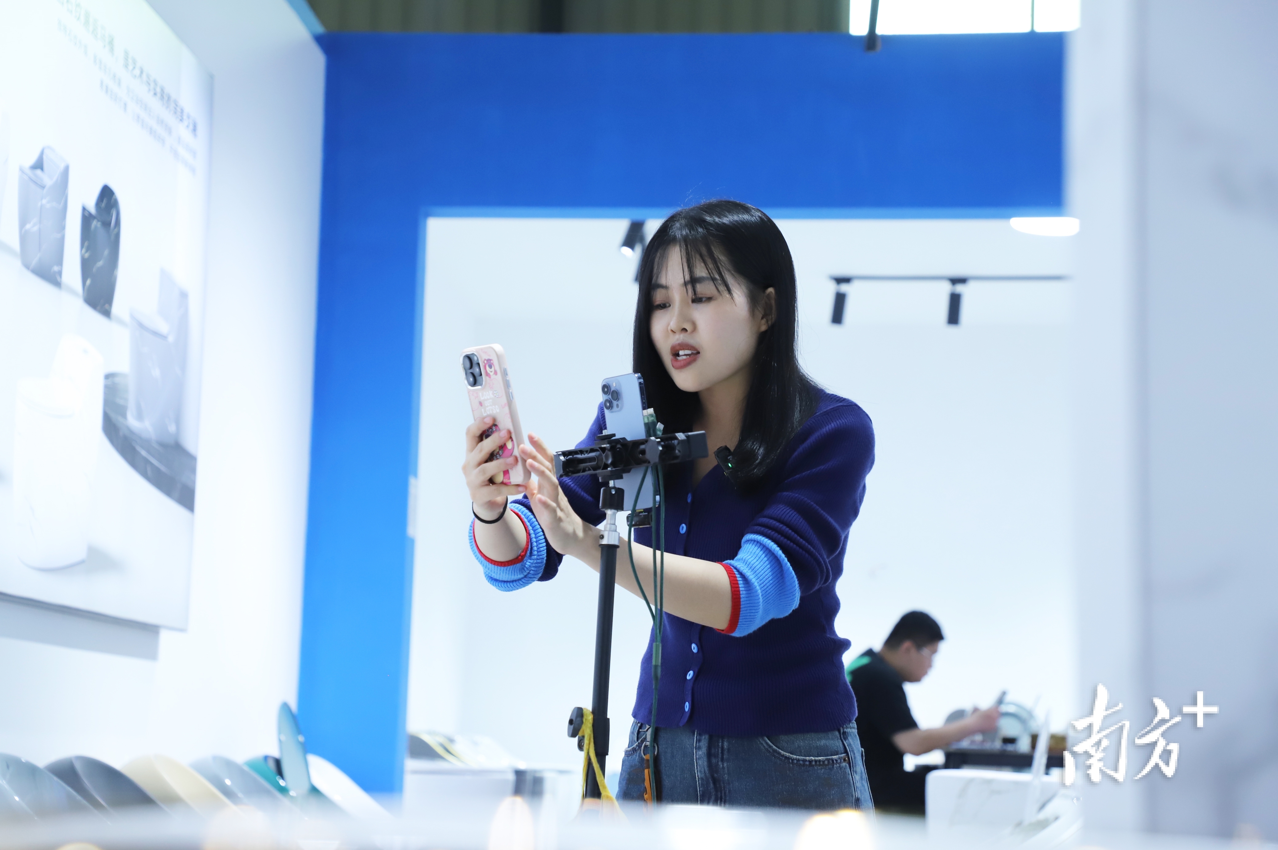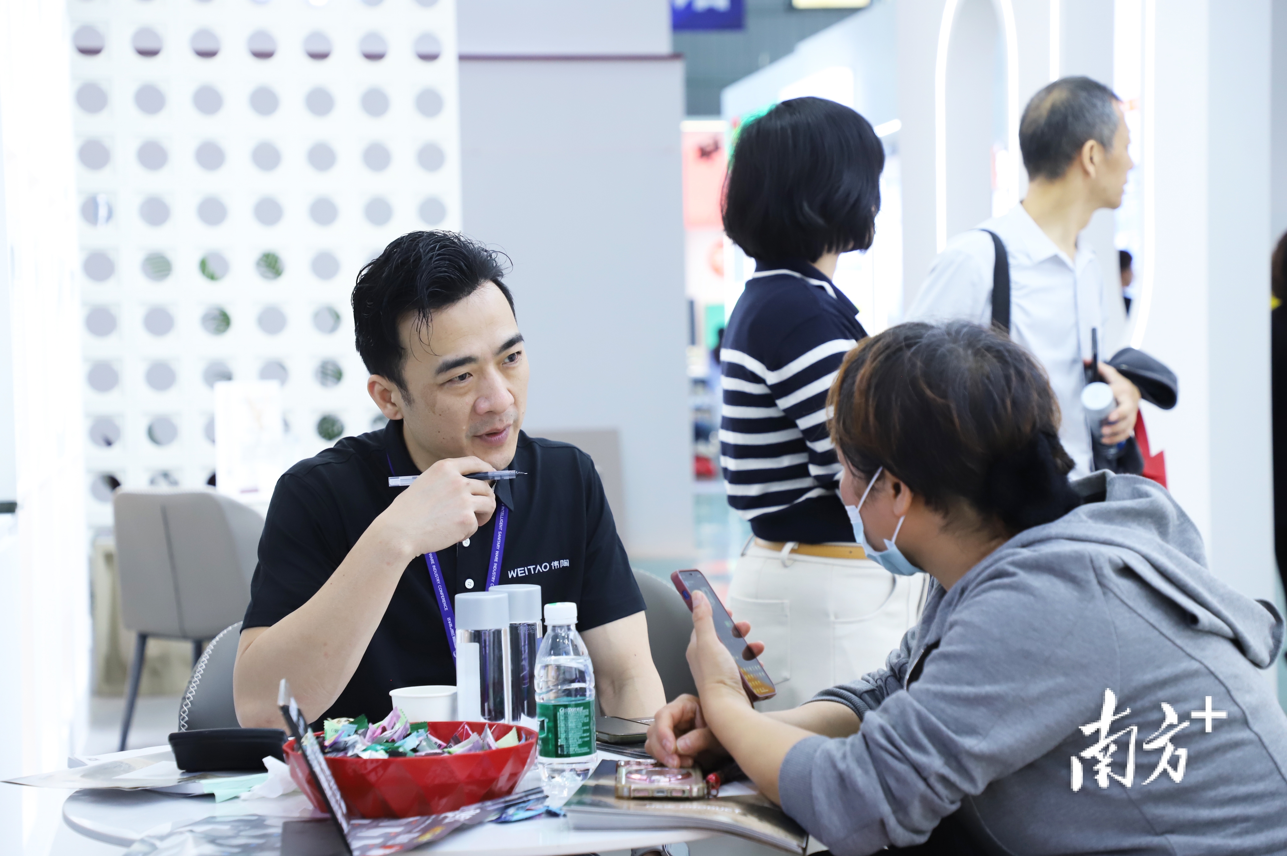 广东爱拉尼展位前,销售人员一边接待往来客商,一边对着手机镜头进行线上直播,忙得不可开交。“既有新客户,也有老客户,根本停不下来。”企业总经理张晓生连喝水都顾不上。他告诉记者,企业在与国内多个知名品牌合作稳住市场的同时,近两年已取得多项出口认证,成功进入北美、加拿大等高端市场。“希望把潮州智能卫浴卖向全球。”