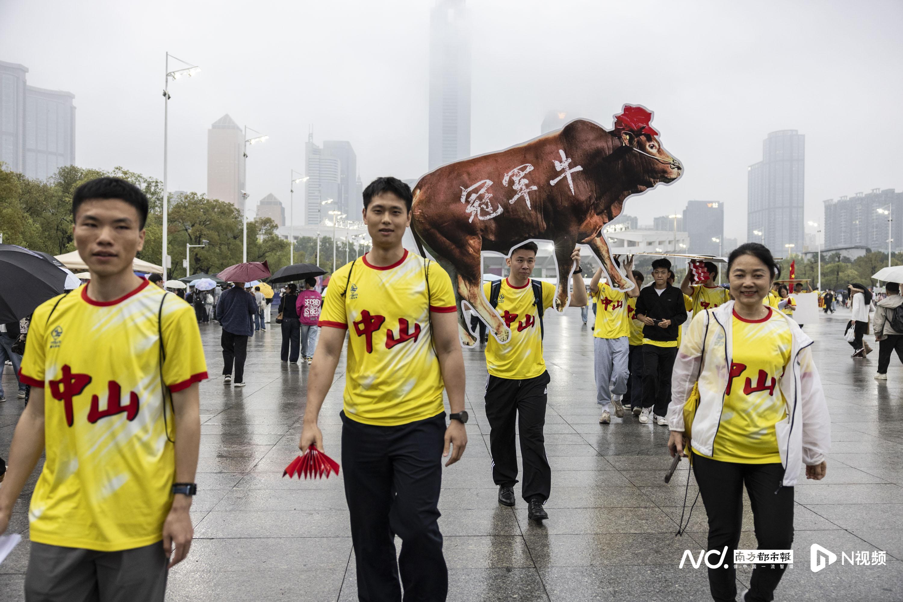 最让我难忘的,无疑是中山300名球迷远征广州的瞬间。比赛当天恰逢下雨,路上还遇上堵车,我特意通过同事联系上中山球迷领队,精准蹲守他们的大巴抵达点。当一辆辆大巴停下,300多名球迷身着统一黄色队服有序下车,手里拿着各式应援物料,甚至把中山队村超冠军的“冠军牛”做成大型KT板带到现场。