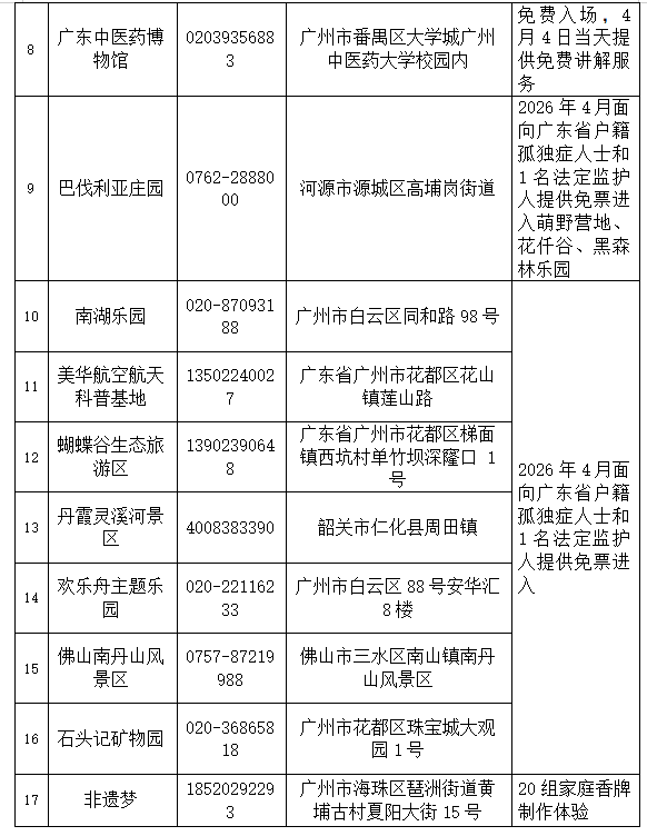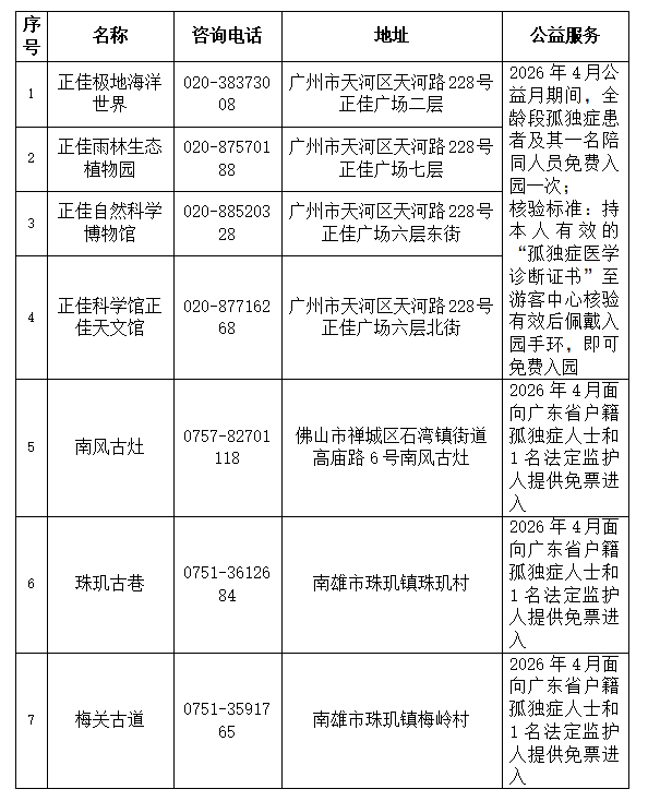 本次活动正式公布首批广东省孤独症儿童家庭关爱联盟(旅游、研学类)单位,首批联盟单位将于2026年4月,面向孤独症人士及1名法定陪同家长免费开放或提供免费服务,孤独症儿童家庭可提前拨打对应咨询电话,具体单位信息如下: