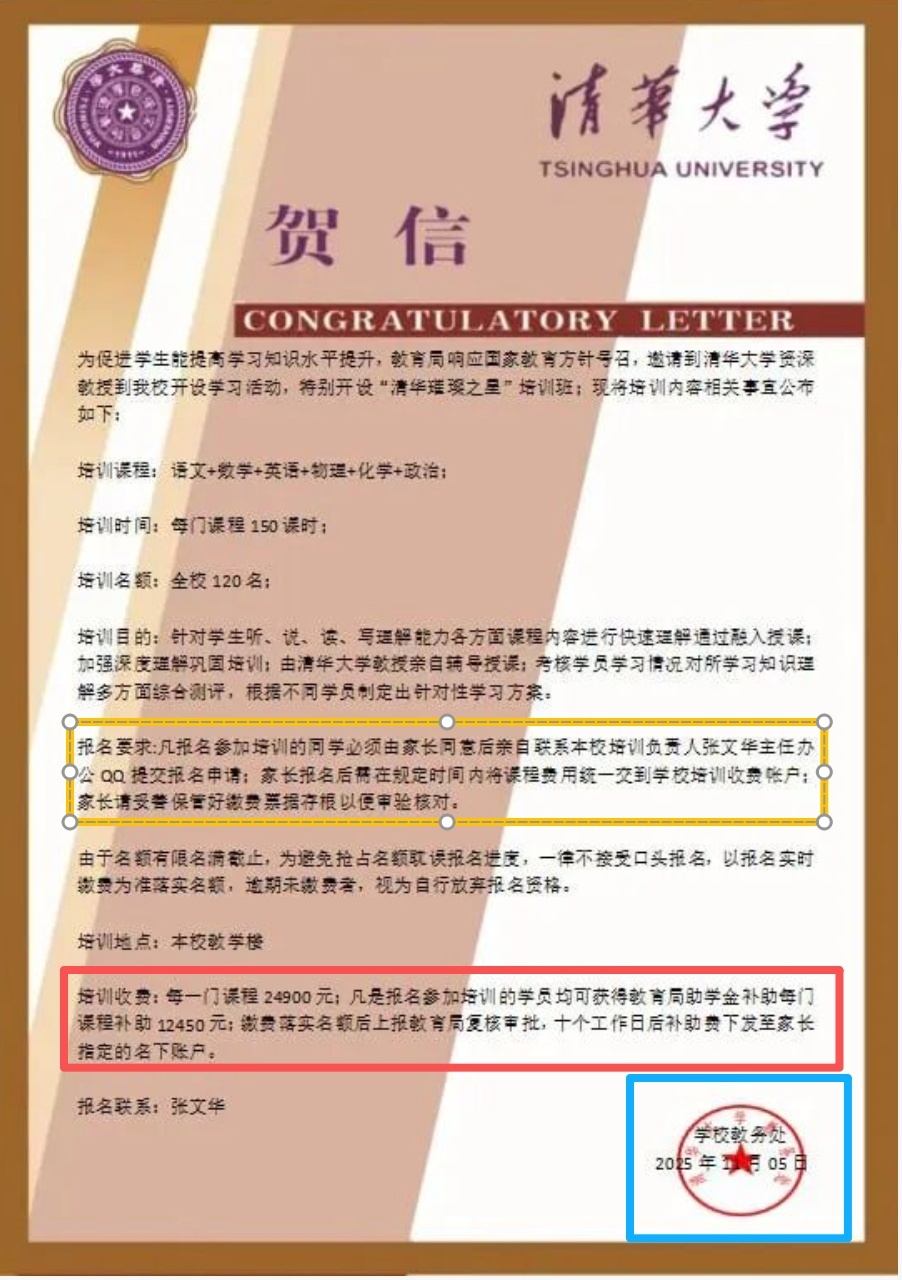 根据网友贴出图片,这封贺信称邀请“清华”的教授到“本校”开设学习活动,但贺信的落款和盖章却是“清华大学教务处”。图中还提到:“每一门课程收取费用24900元,凡是报名参加培训的学员均可获得教育局助学金补助,每门课程补助12450元。”“缴费落实名额后上报教育局复核审批,十个工作日后补助费下发至家长指定的名下账户。”