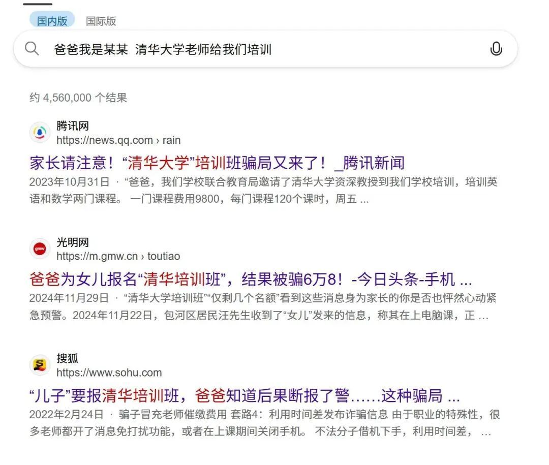 搜索发现,利用“清华大学培训”诈骗并非新鲜事,在社交平台上就有不少网友分享自己收到此类诈骗短信的经历,都是先收到一条试探性短信,如果回复了对方,对方紧接着以“学校通知报名很快截止,怕晚了报不了”为由,催促家长添加报名“老师”微信,进行线上缴费。