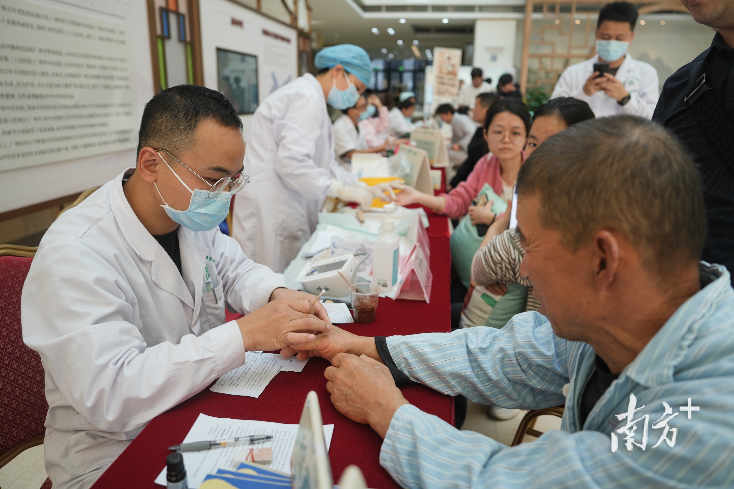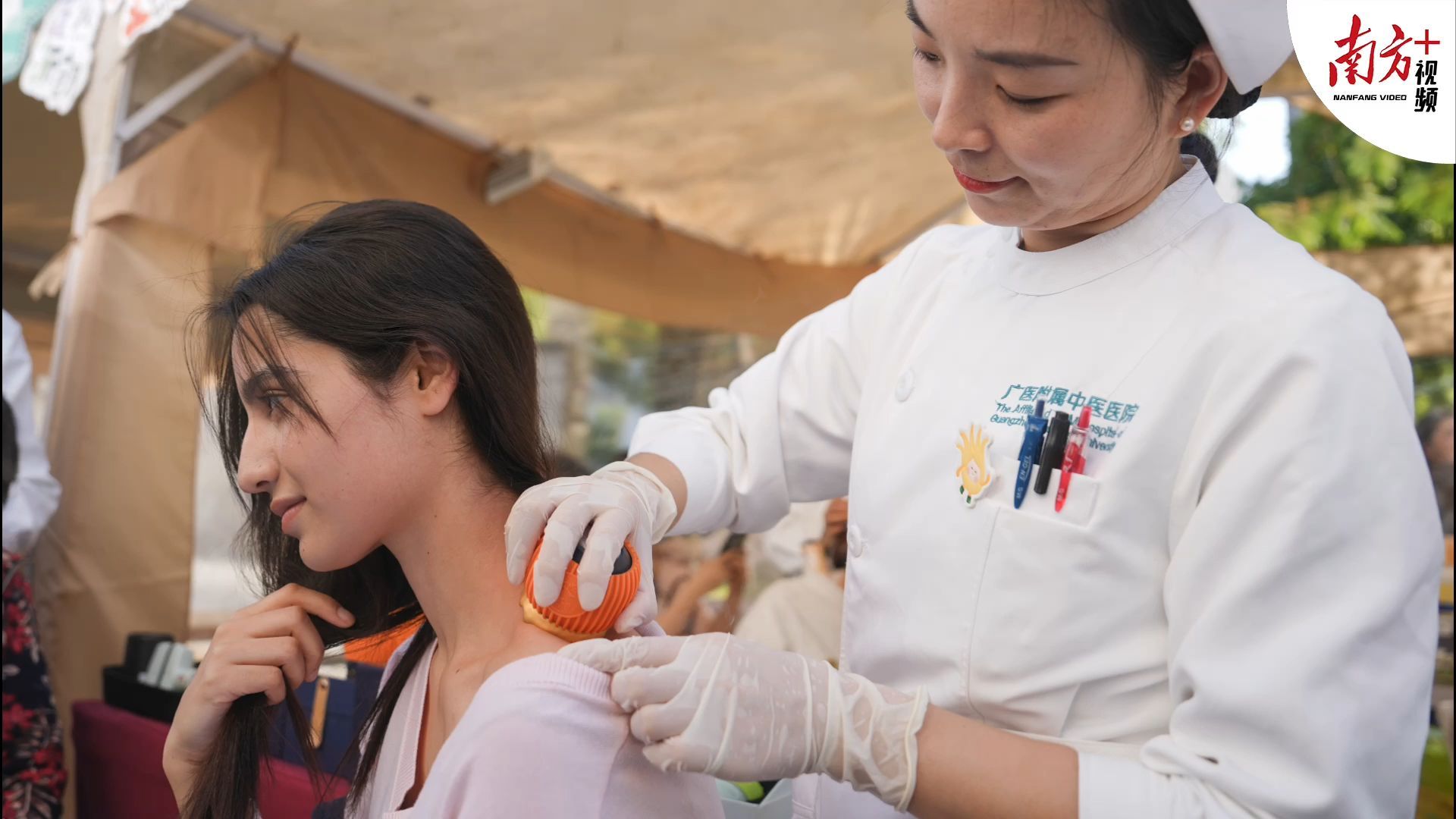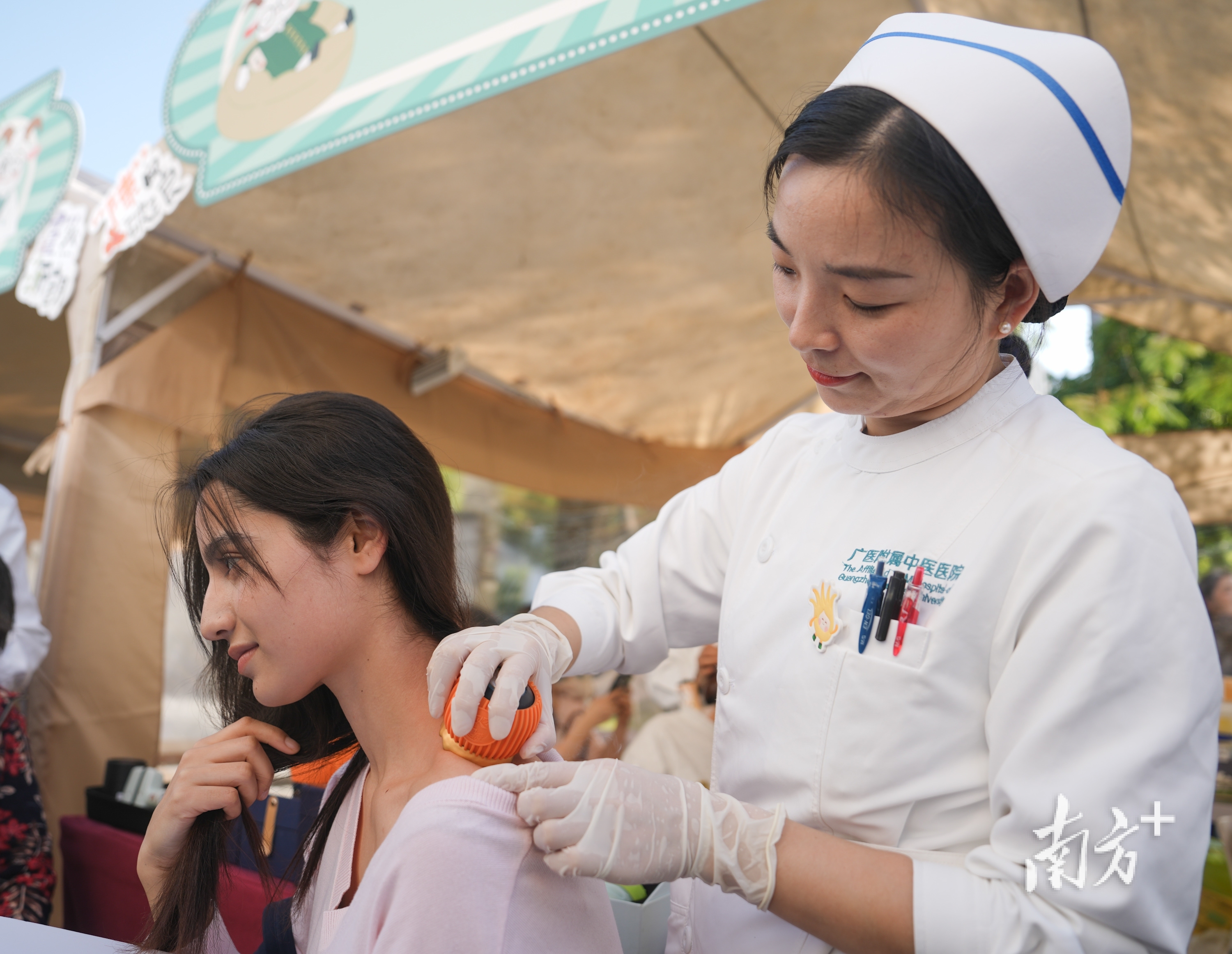 在传统中医疗法体验区,广州医科大学附属中医医院主管护师田泓正在为陈女士进行肩颈刮痧。“这样给你刮痧疼吗?”她一边操作一边轻声询问。