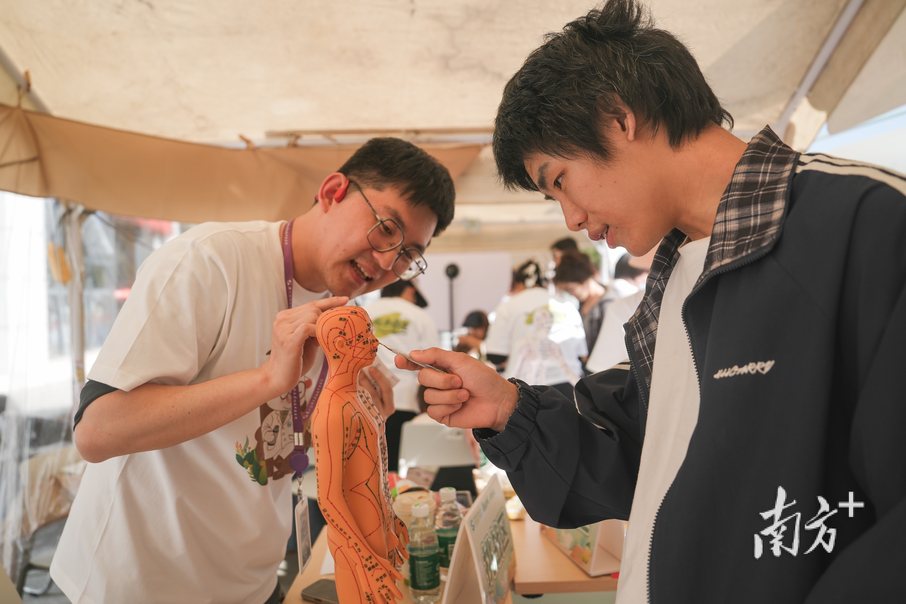 另一边,“神针小侠”穴位闯关小游戏吸引了许多孩子参加。“这是天突穴,这是鱼际穴、这是丰隆穴。”在工作人员的提示和现场学习后,10岁的乐乐(化名)准确指出穴位模型中的对应位置,赢得了闯关印章。