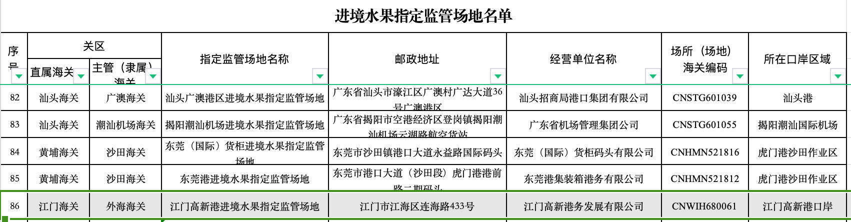 最近,海关总署官网更新进境水果、肉类指定监管场地名单,江门高新港均上榜。这标志着企业可以在高新港开展进口肉类和水果业务。