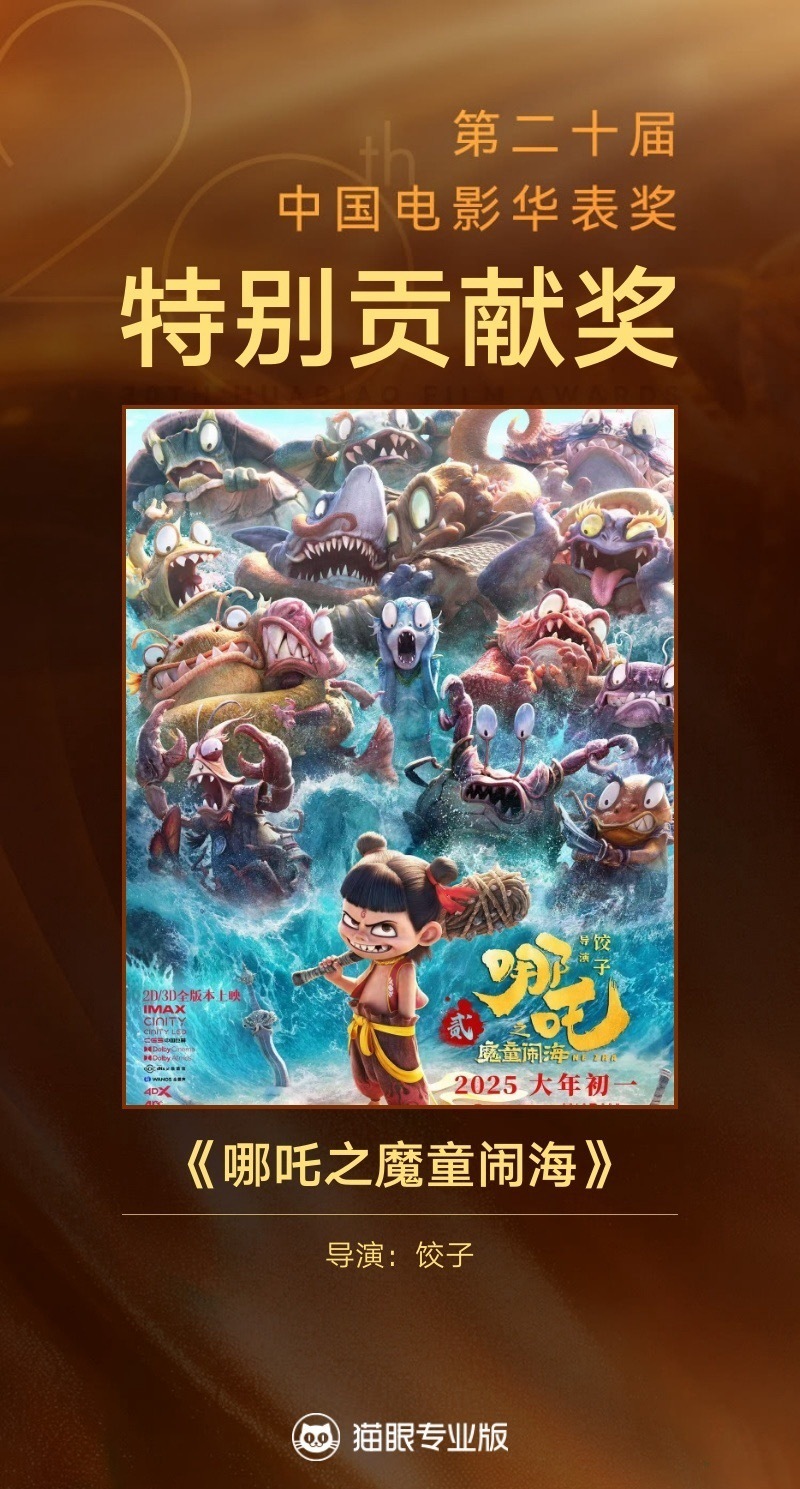 今年4月,在第二十届中国电影华表奖颁奖活动上,《哪吒2》被授予“特别贡献影片”奖项,以表彰该片对2025中国电影市场的巨大贡献。