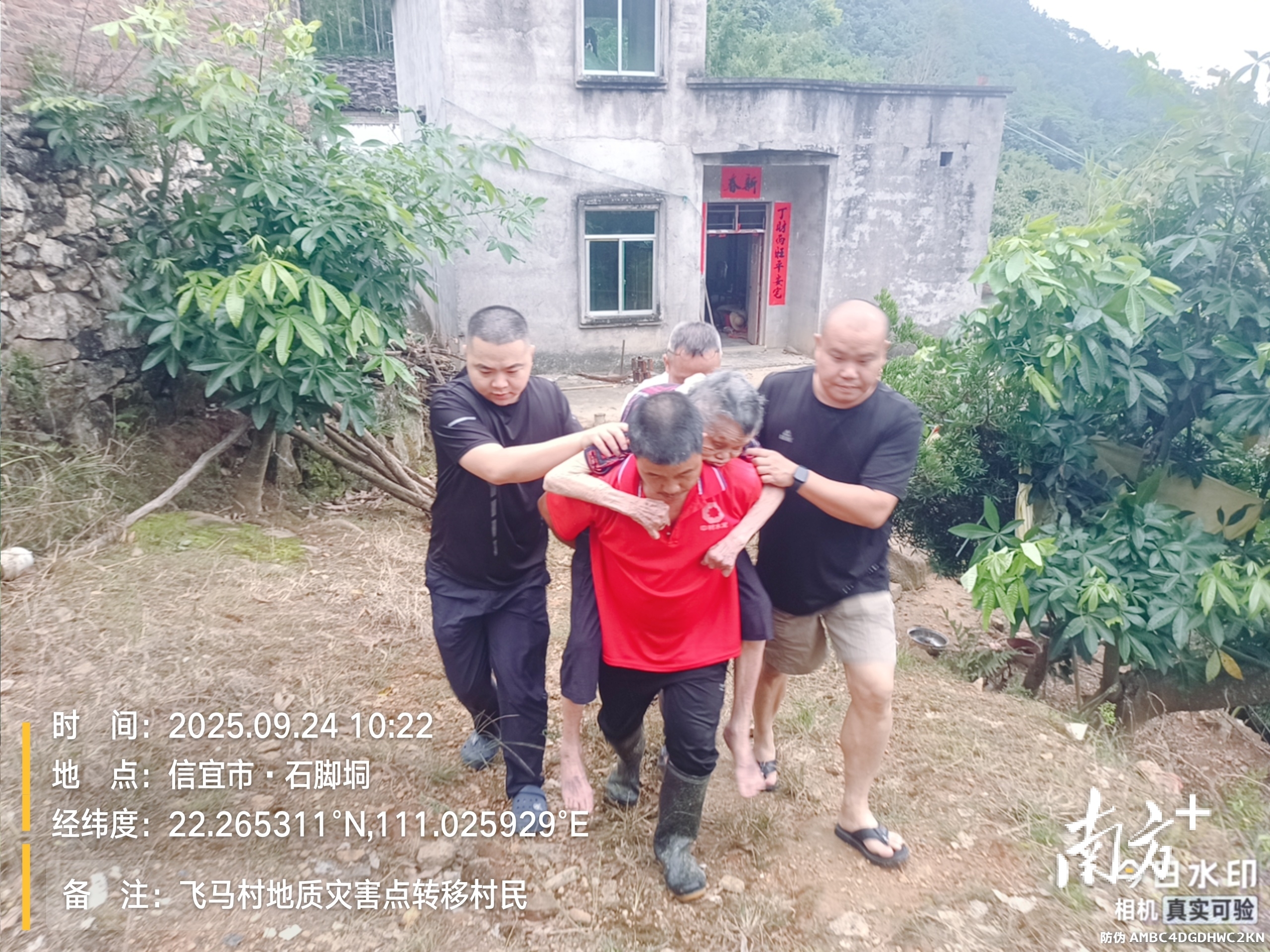 水口镇飞马村兵支书文高良、水口镇国土自然资源所退役老兵张成辉到飞马村地质灾害点转移群众。