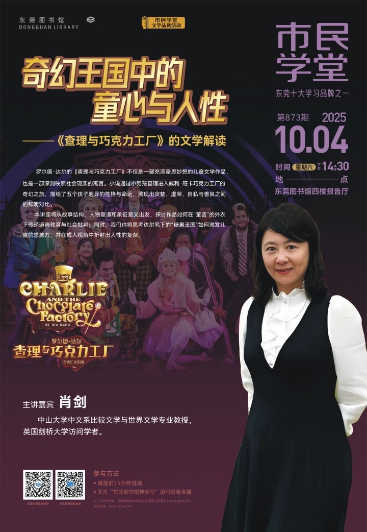 10月4日14:30,东莞图书馆将邀请中山大学中文系比较文学与世界文学专业教授,英国剑桥大学访问学者肖剑在四楼报告厅开讲《奇幻王国中的童心与人性——<查理与巧克力工厂>的文学解读》。