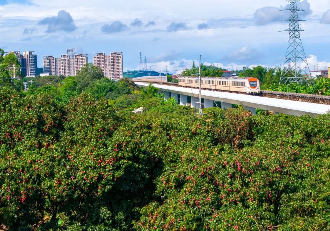 殷熙作品《从城地铁荔枝红》则将荔枝与从化地铁14号线巧妙融合构图,列车穿越荔枝林、奔向未来,反映城市交通设施建设发展日新月异。