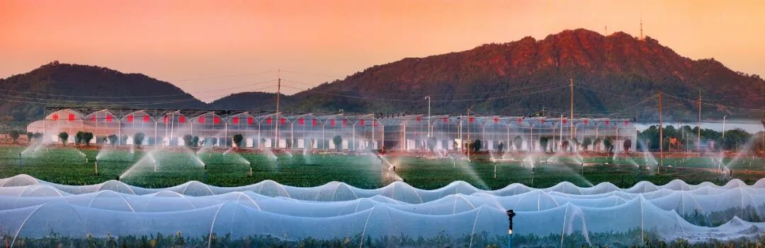 罗素文作品《大棚喷淋》拍摄于太平镇井岗村从玉菜场,黄昏斜阳之时,自动化喷淋装置启动的刹那,水珠纵横交织于翠色之上,作者用了低机位的航拍长画幅,全面的展现了前、中、后景以及远山,通过照片反映农业科技之美。