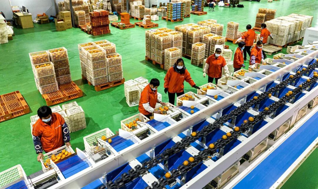 从化资深摄影人巢金红在鳌头镇鹿田村UMIZZ柑橘星球产业园拍摄《科技兴农》,反映在水果丰收季,工作人员在自动化生产线前分拣、打包成熟的玫瑰柑并准备发往市场的场景。