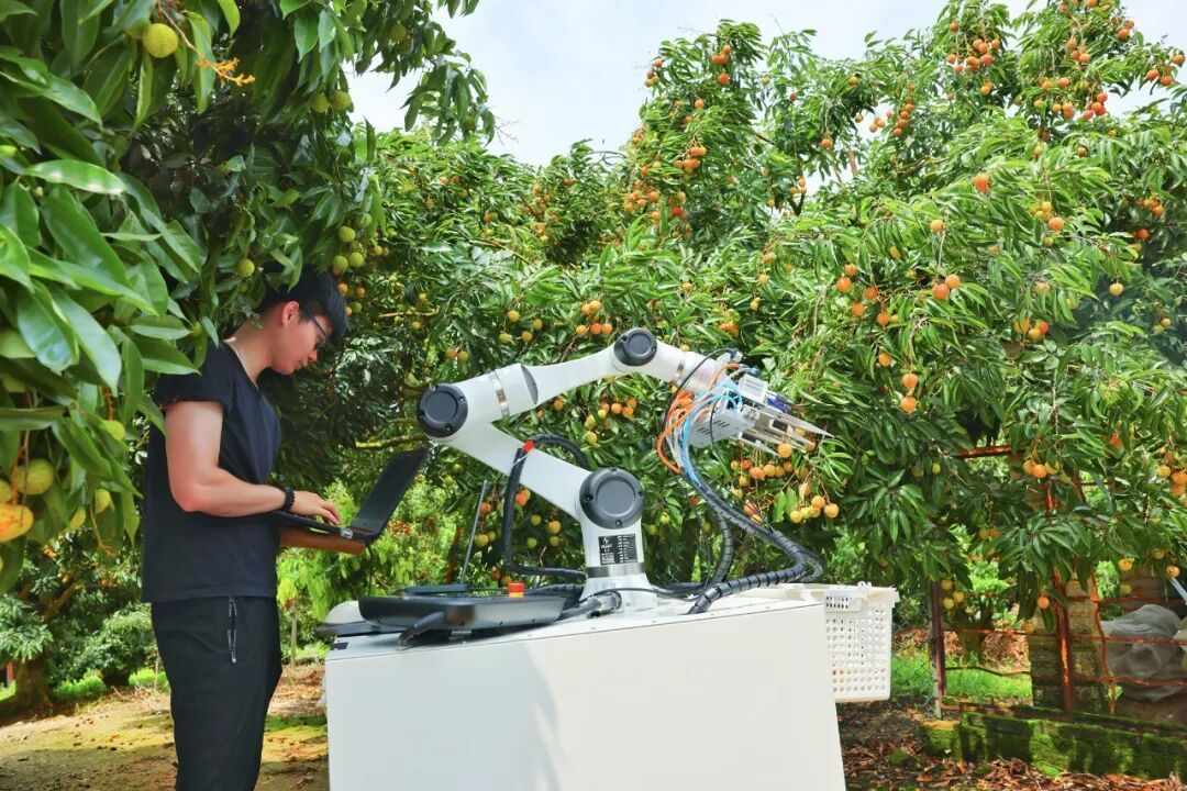 李志锋的《机器人摘荔枝》拍摄于从化荔枝文化博览园的智慧果园内,描绘了应用农业前沿科技的场景,工作人员利用搭载“荔知君”AI大模型的采摘机器人进行采摘,1分钟内可采摘60颗荔枝。
