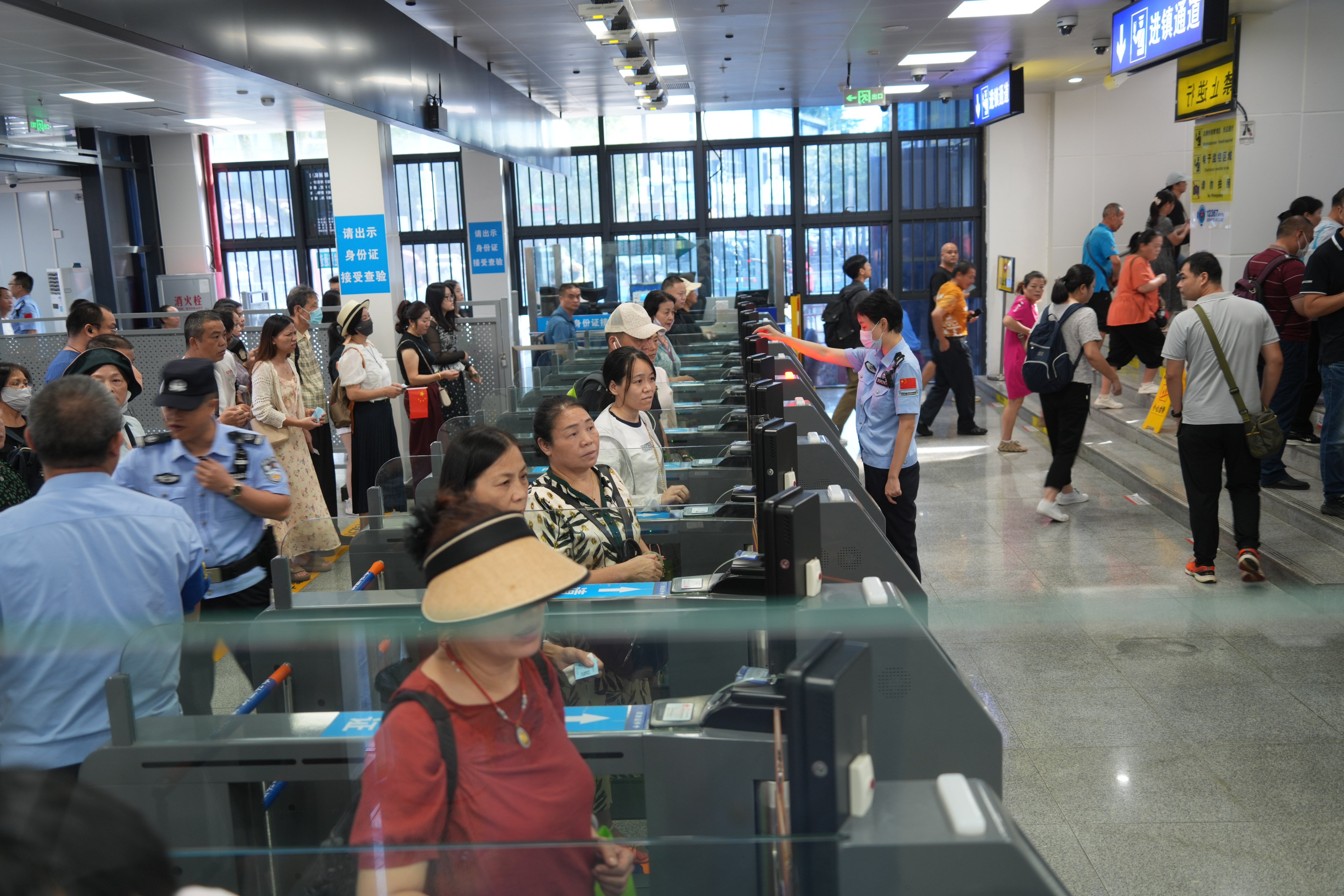 面对外地游客、本地市民与镇内居民“三潮叠加”的客流高压态势,边检部门加强监测预警,并依托“两公布一提示”机制,提前对接旅行社、发布客流信息,引导旅客错峰出行。同时,为老人、儿童、家庭游客及团队提供全流程引导,并开设紧急办证绿色通道、居民通行快核等专项服务,全面优化通行体验。