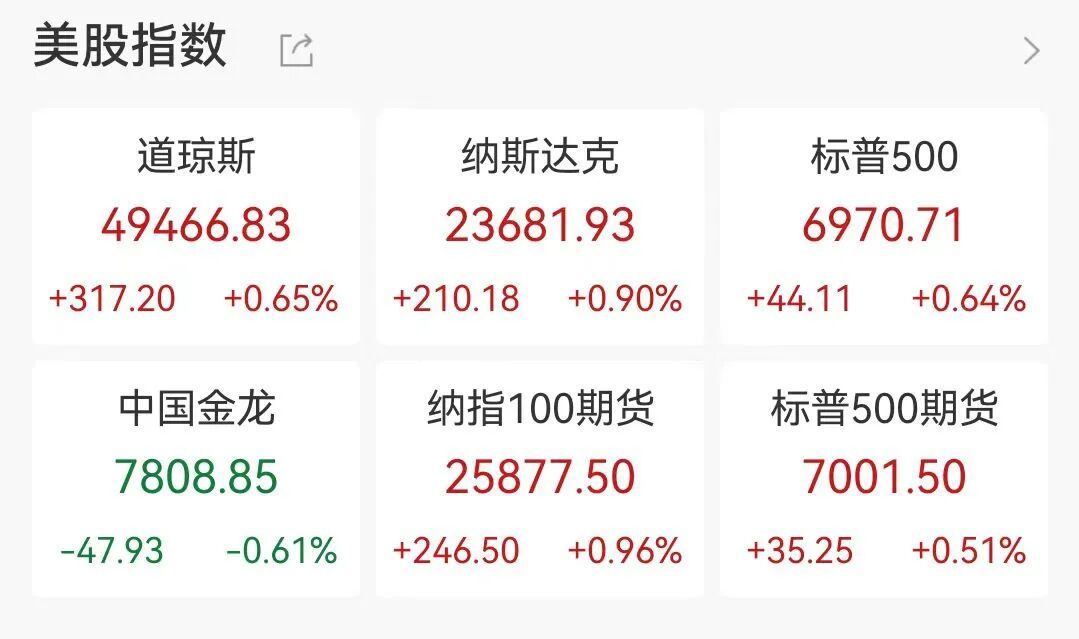 1月15日美股开盘,三大指数集体高开全线走高,截至23:25,道指涨0.65%,飙升超300点,纳指涨0.9%上扬超200点,标普500指数涨0.64%,热门中概股走低,金龙指数下跌0.61%。