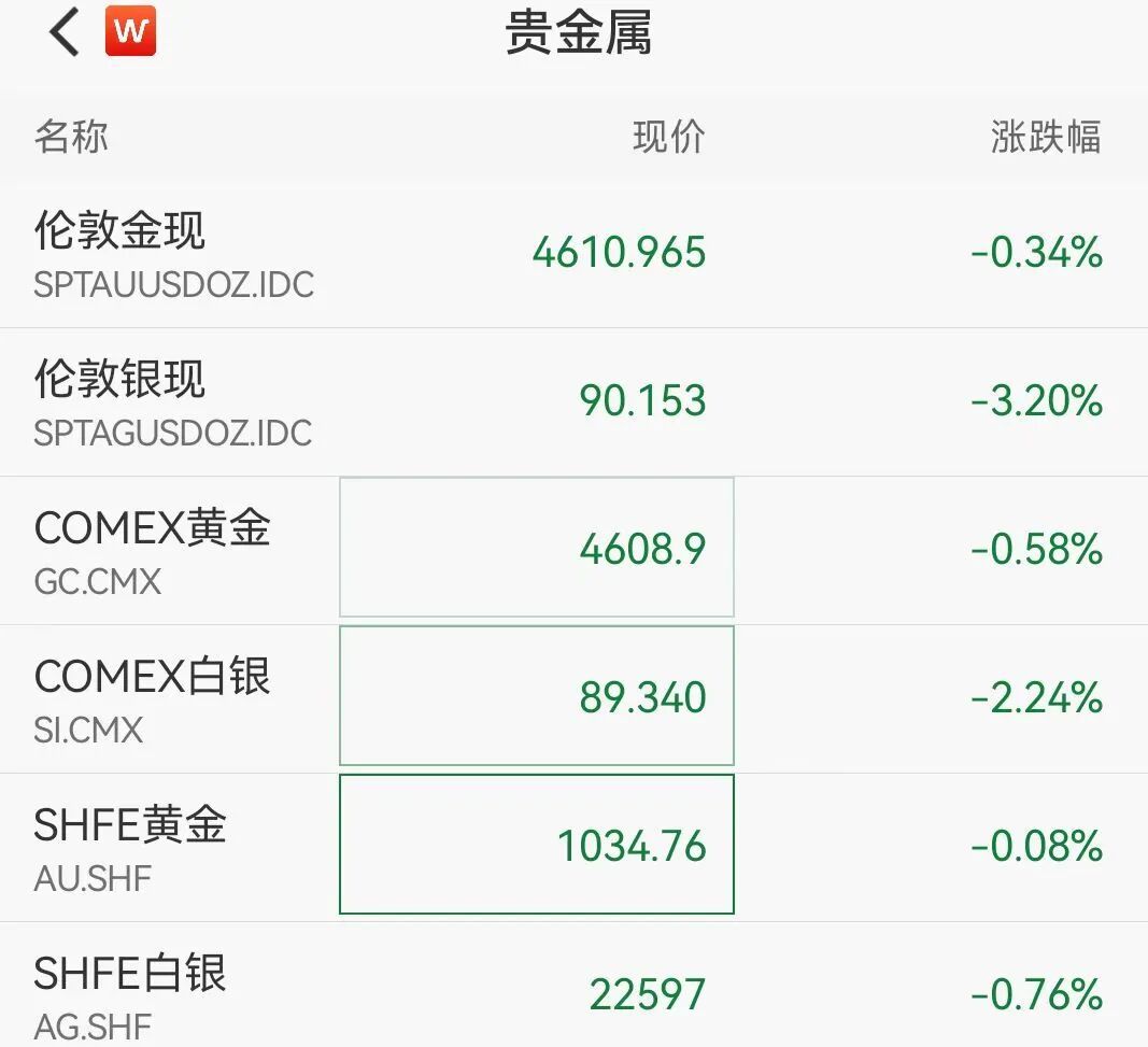 贵金属全线下跌,黄金、白银继续走低。现货白银短线快速大跳水,跌幅超3%,跌破91美元/盎司,现货黄金失守4620美元/盎司,日内跌超0.34%,COMEX黄金跌幅扩大至0.58%。