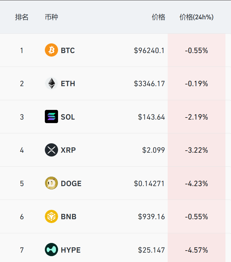 加密货币方面,主要币种多数下跌,比特币逼近9.6万美元,以太坊跌0.19%,狗狗币跌超4%,过去24小时全球超12万人爆仓。