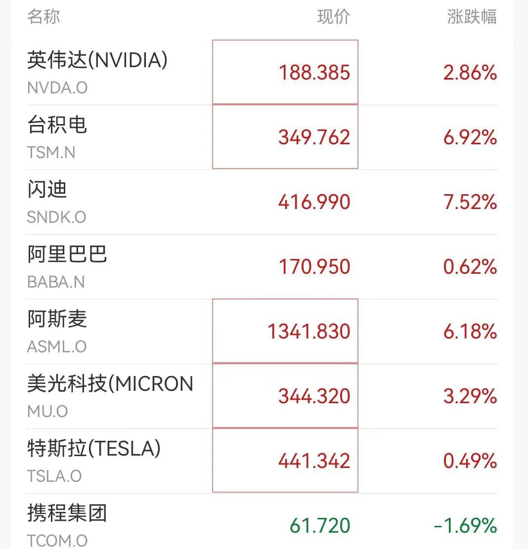 英伟达涨近3%,闪迪涨幅超7%再破新高,阿斯麦涨超6%,美光科技涨超3%,西部数据、希捷科技涨超3%。