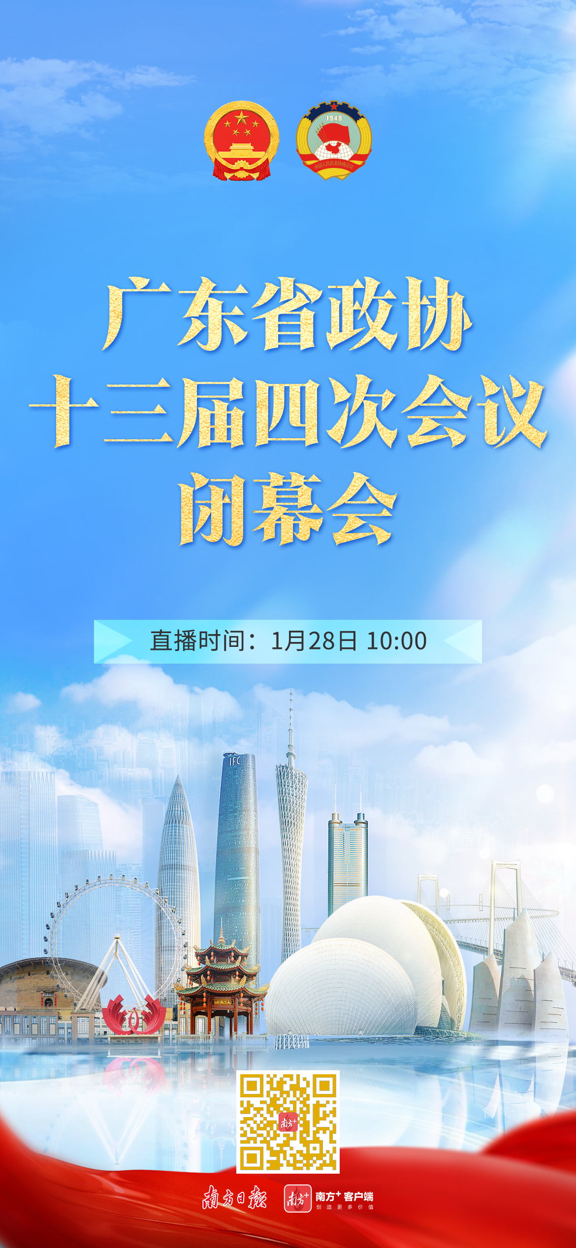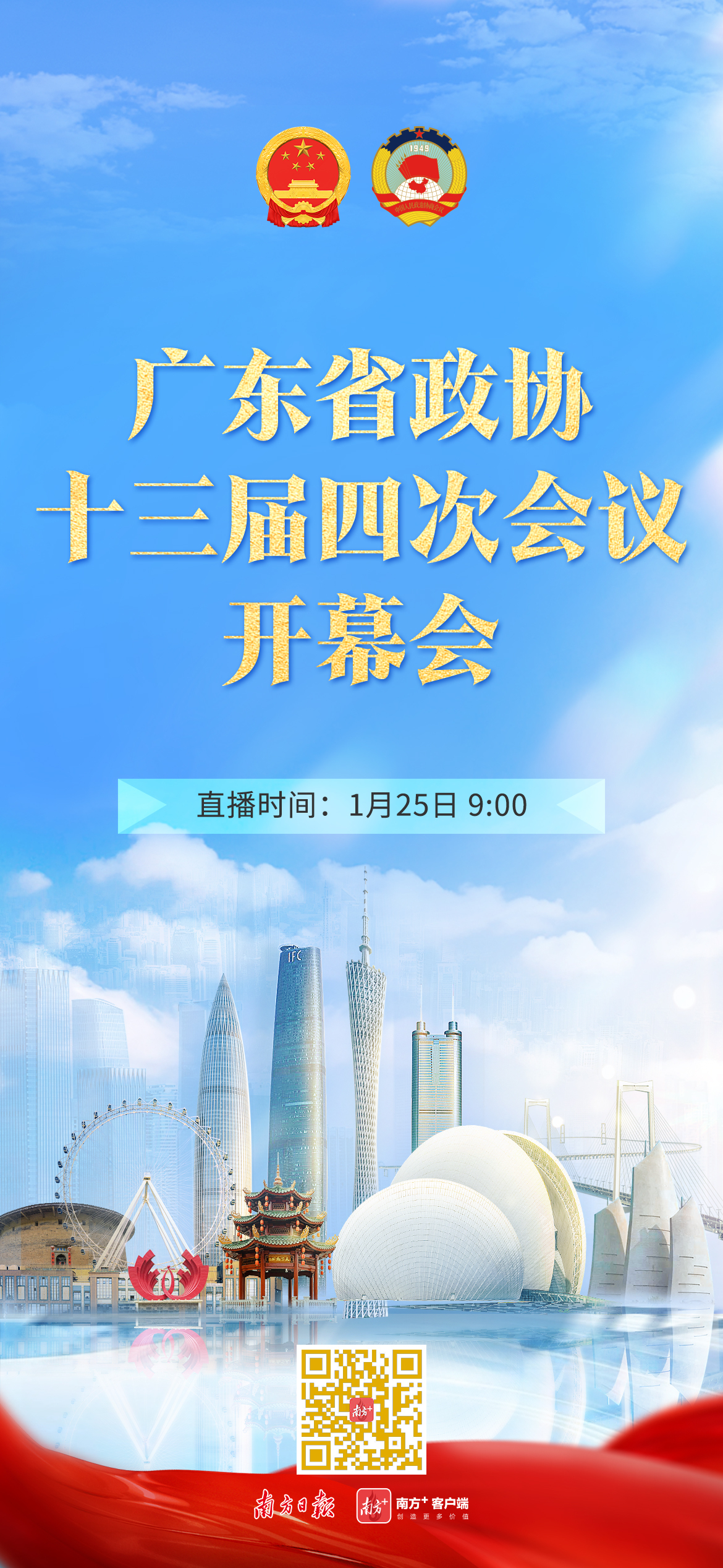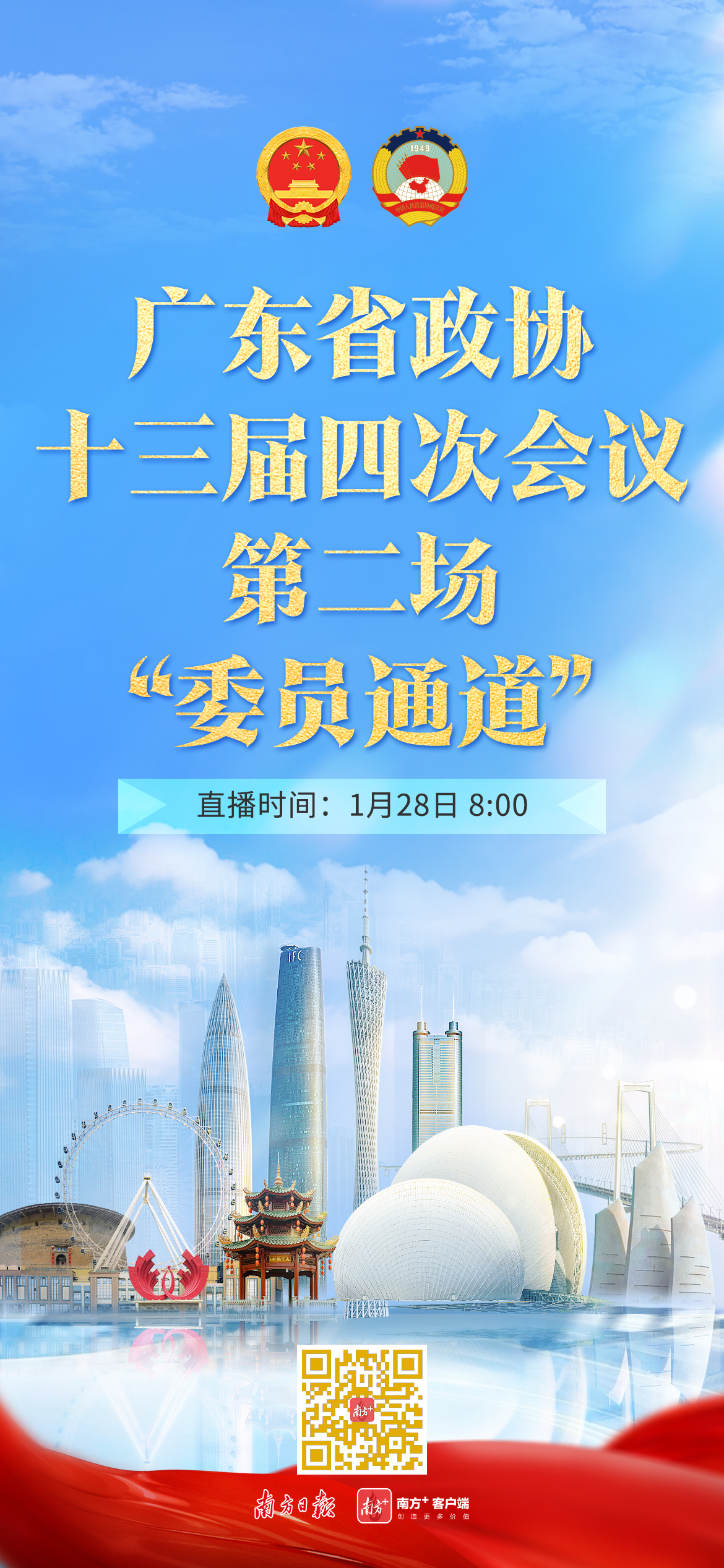 广东省政协十三届四次会议定于1月25日上午至28日上午在广州召开,会期三天半。会议共安排4场直播,分别是开幕会、2场“委员通道”和闭幕会。
