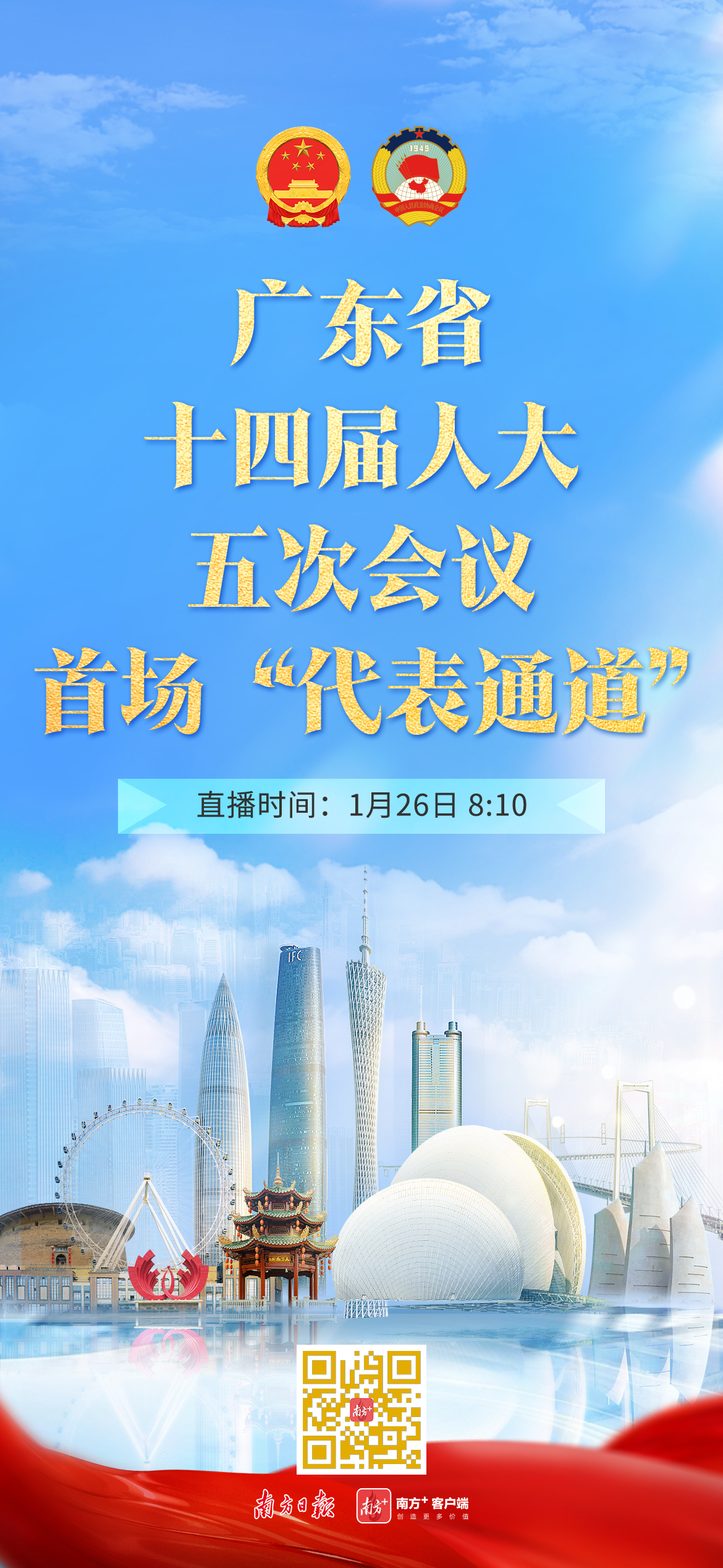 广东省十四届人大五次会议定于1月26日上午在广州开幕,29日上午闭幕,会期三天半。会议共安排7场直播,分别是开幕会、第二次全体会议、2场“代表通道”、2场记者会和闭幕会。