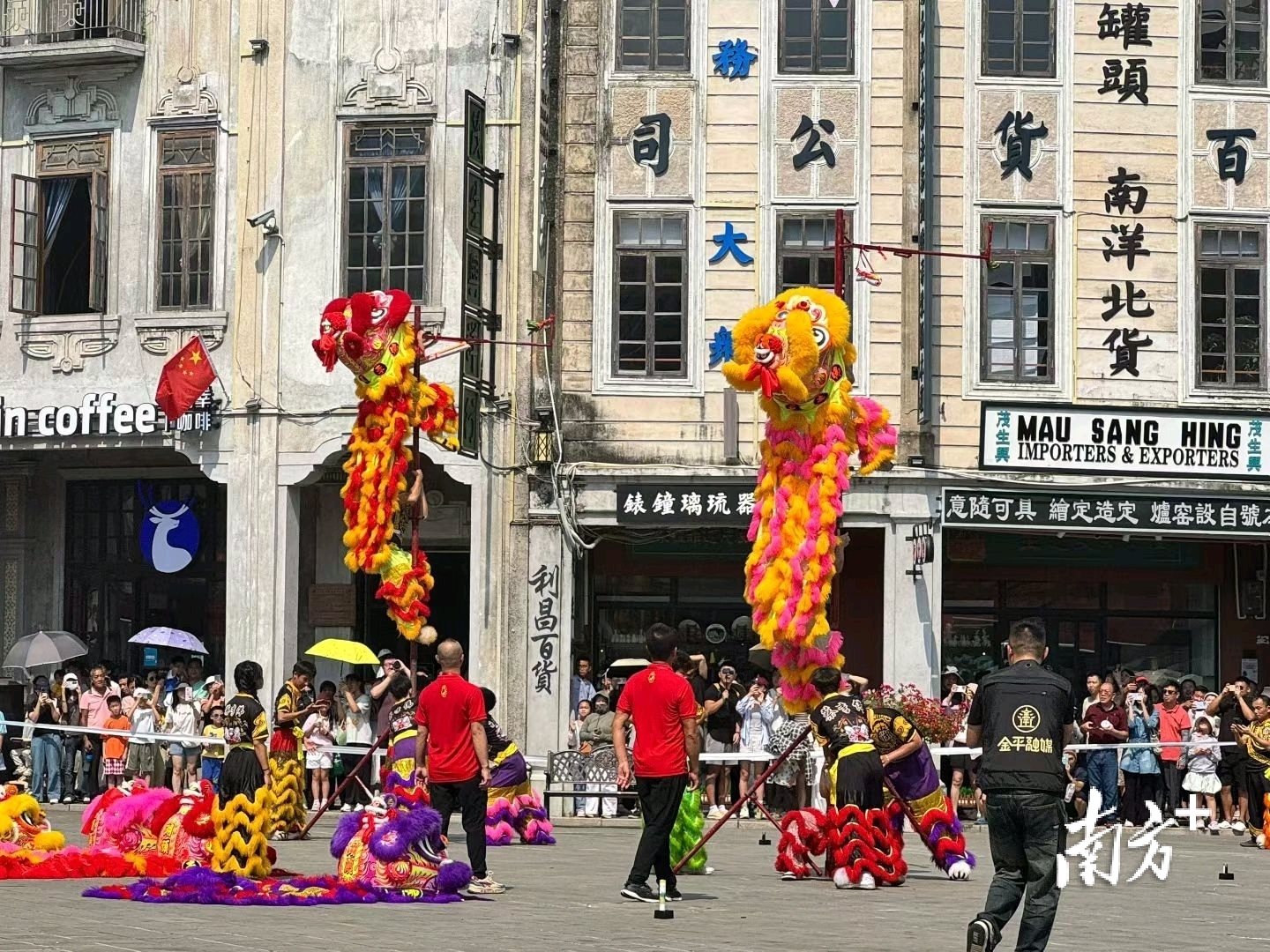 张灯结彩的骑楼街里,舞龙舞狮、英歌舞等民俗表演,拉满过年氛围。