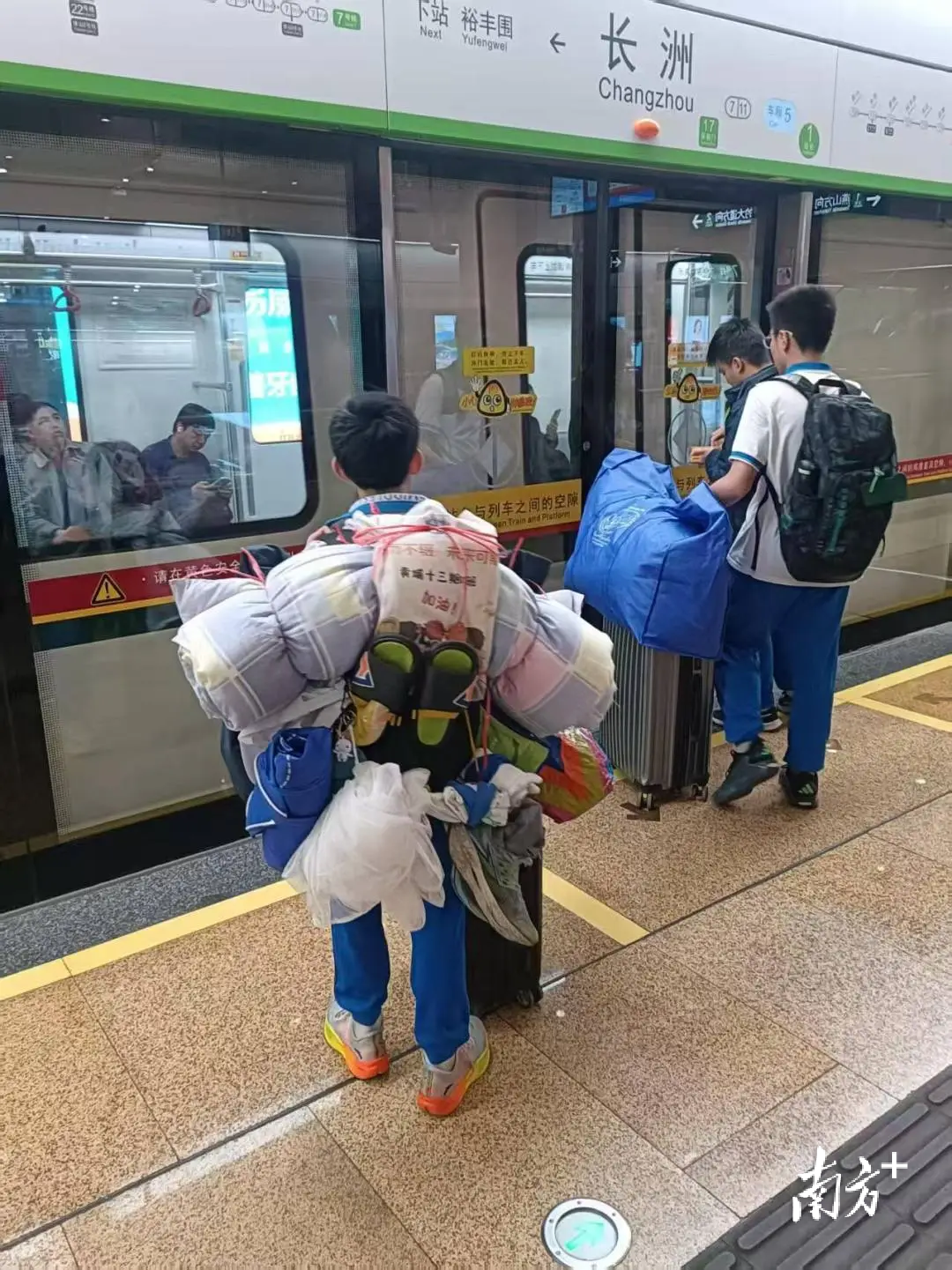 一名身穿校服的中学男生,拉着行李箱、肩背多个打包好的行李,独自乘坐地铁回家。