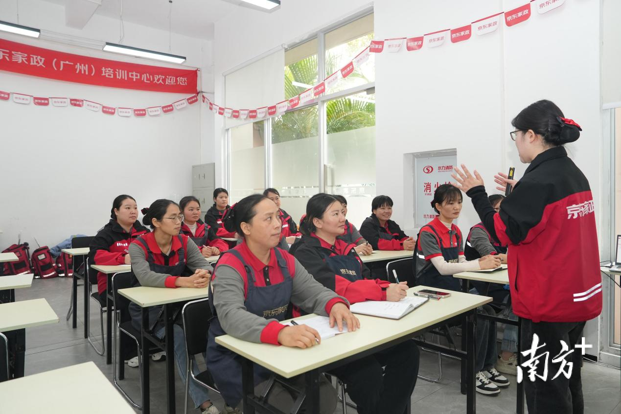 在距离唐大伟家不远的睿志创意园,王培菊所在的京东家政广州培训中心,刚忙完一节保洁师和家电清洁师的“回炉培训”,又紧接着要张罗一场新招聘员工的入职培训。